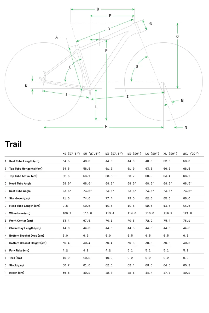Smaller wheel sizes of Trail roll on 27.5" wheels, while larger frame sizes come with 29" wheels to deliver the best blend of fit, fast and fun for every rider.