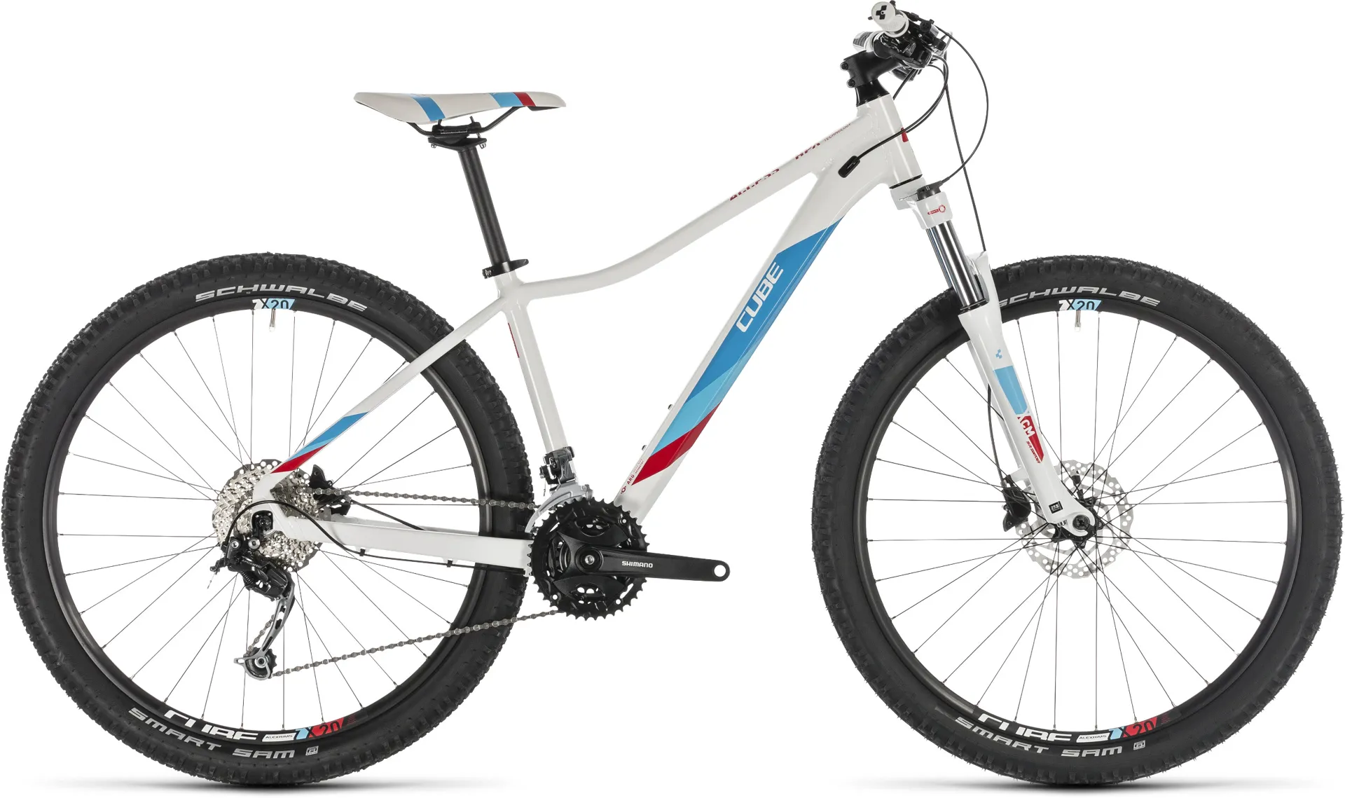 Whichever one you choose, the light and grippy Schwalbe Smart Sam 2.25 in tyres, combined with the remote lockout-equipped Suntour fork and powerful Shimano hydraulic disc brakes, give you all the comfort and control you'll need to tackle any trail with confidence. Smooth-shifting and wide-ranging Shimano gears will help you tackle even the steepest of climbs, and Cube selected the rider contact points - like grips, handlebar and saddle - specifically to fit the female form. Get inspired, and get riding... on the Access WS Pro.