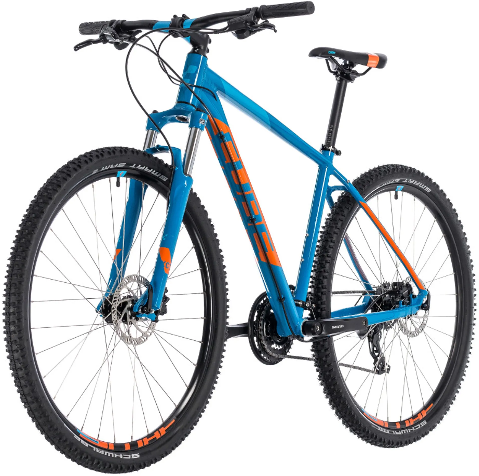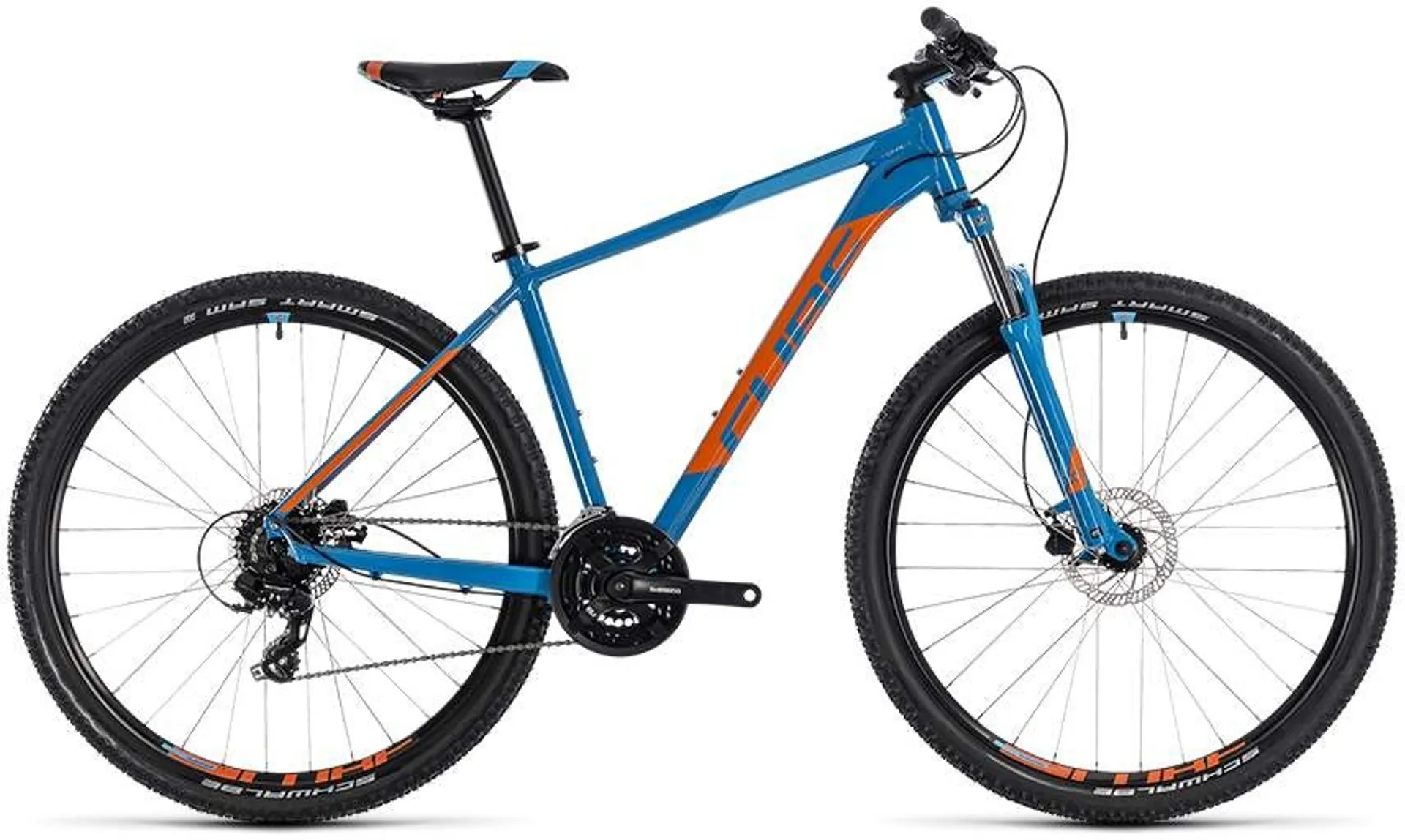 The Cube Aim Pro 2018 is all about good standards. Featuring a lightweight 6061 aluminum frame offering great riding qualities, such as ride stiffness, accompanied with the SR Suntour XCT 100mm fork, this bike has it all. Tektro hydraulic disc brakes provide fantastic all weather stopping power, combine that with the Schwalbe Smart Sam Tyres and you have the ultimate cycling machine. The Smart Sam tyres offer a great level of grip and durability both on and off road. The Shimano 24 speed gears give you a good range in order to tackle the toughest of terrain.