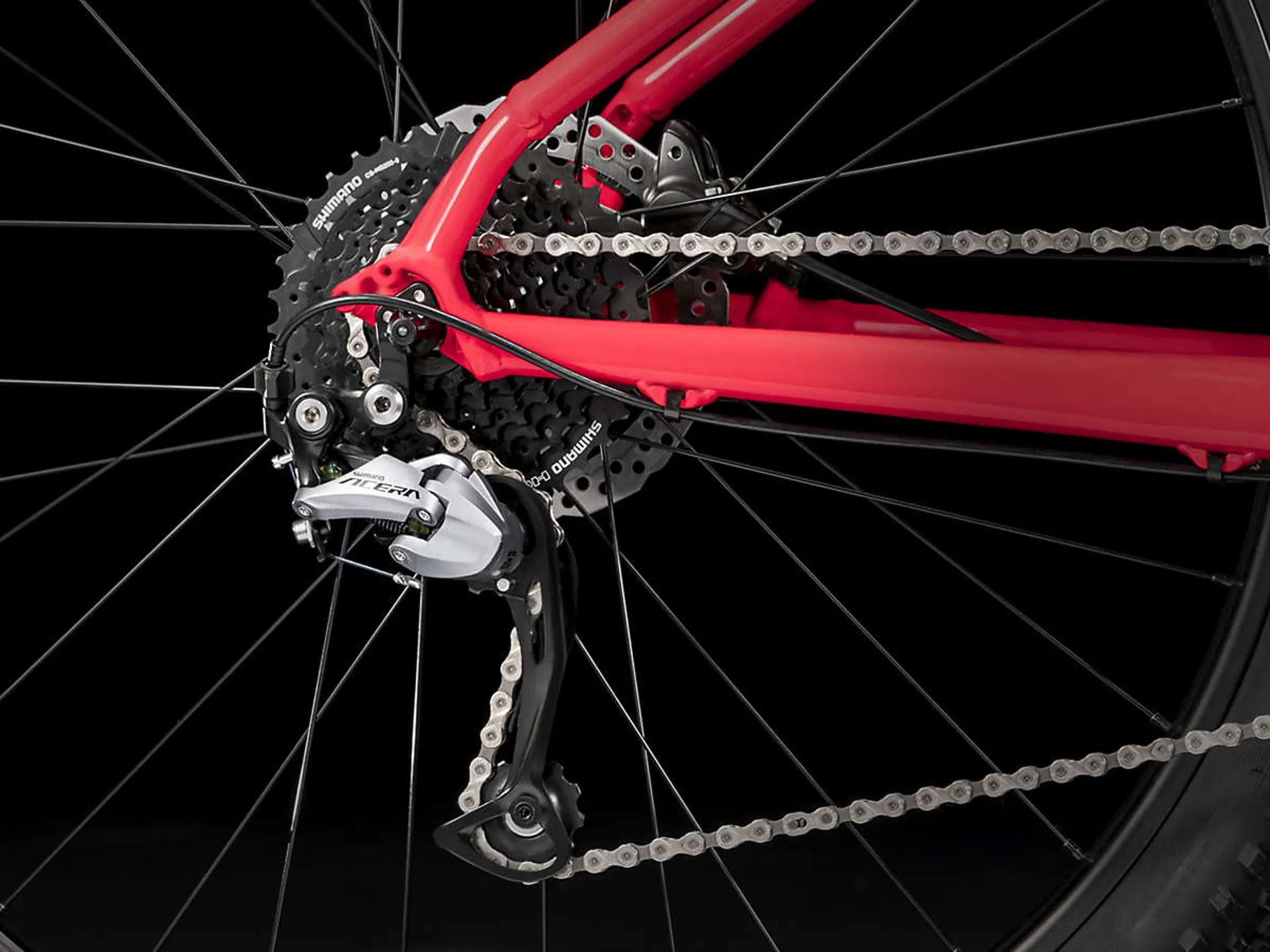 • Bontrager Connection rims with Formula hubs, paired to Bontrager XR2 29" tyres (13.5" & 15.5" frame sizes have 27.5" wheels)
