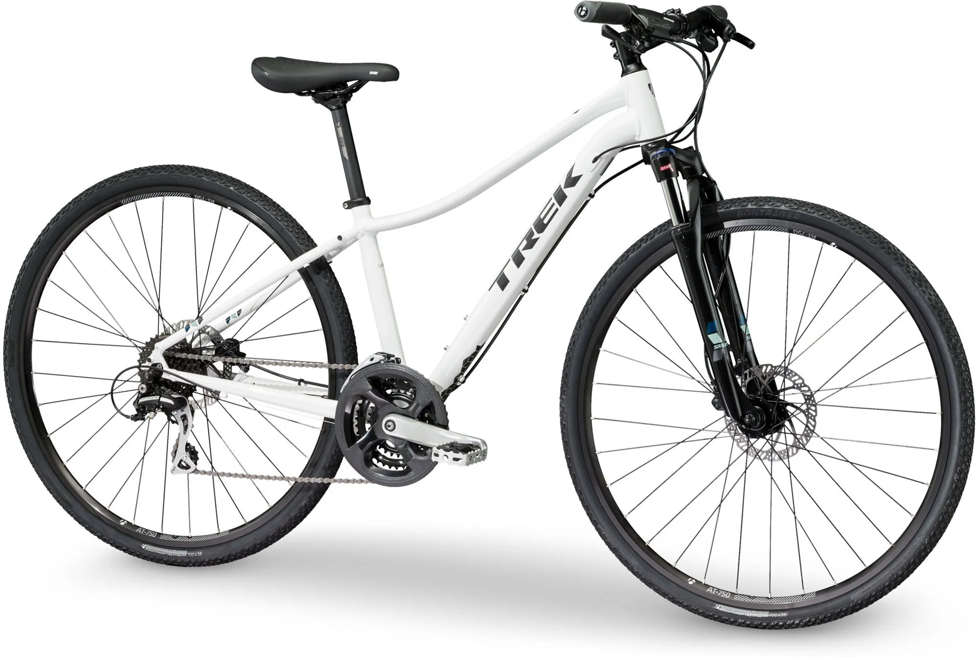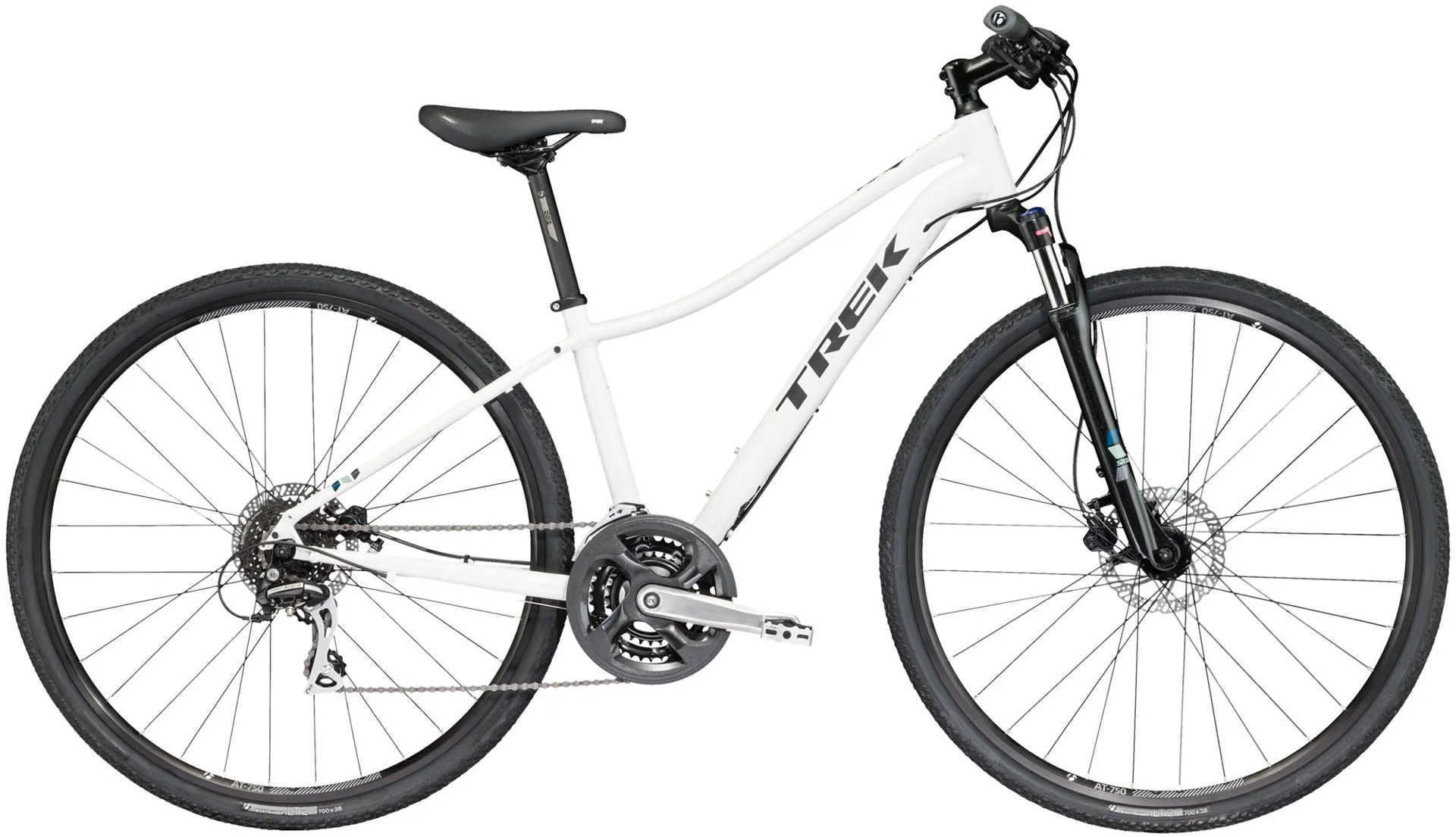 The Trek Neko 2 Womens Hardtail Mountain Bike 2017 is a perfect hybrid: part refined women’s city bike, part trail ride, with fast 700c wheels, suspension and a smart frame that’s DuoTrap S compatible for fitness tracking. Why choose between road and trail? Neko is built for adventure on or off the road, ready to take you from week to weekend and back in comfortable, confident style.