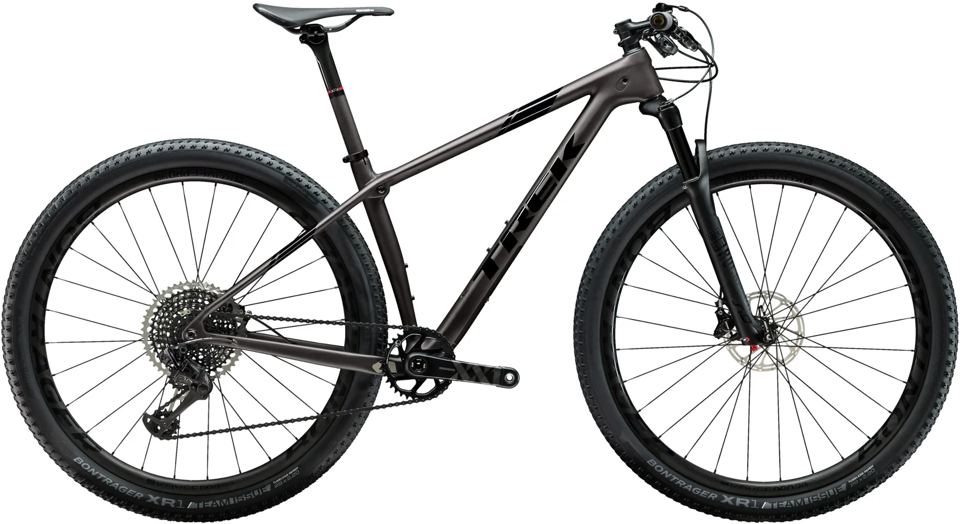 With a race-ready XC bike under 9 kg. Our super-light SL OCLV Mountain Carbon frame with trail-smoothing IsoSpeed, RockShox SID SE Carbon fork with remote lockout, Bontrager Kovee Pro 30 carbon wheels with a 108-tooth Rapid Drive rear hub for instant engagement, SRAM XX1 Eagle 1x12 drivetrain, super-light SRAM Level Ultimate carbon hydraulic disc brakes and Bontrager XXX carbon seatpost and handlebar.
