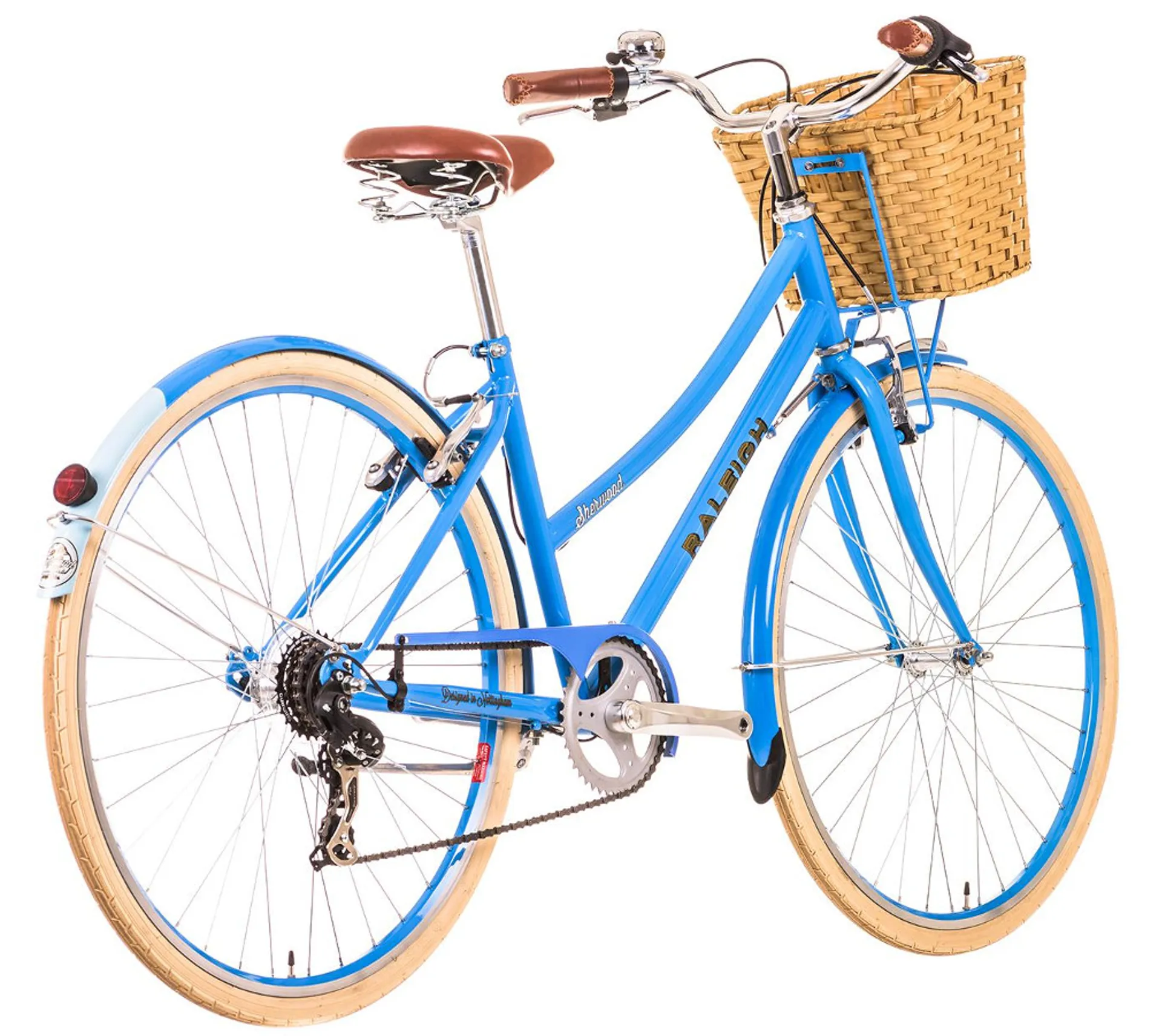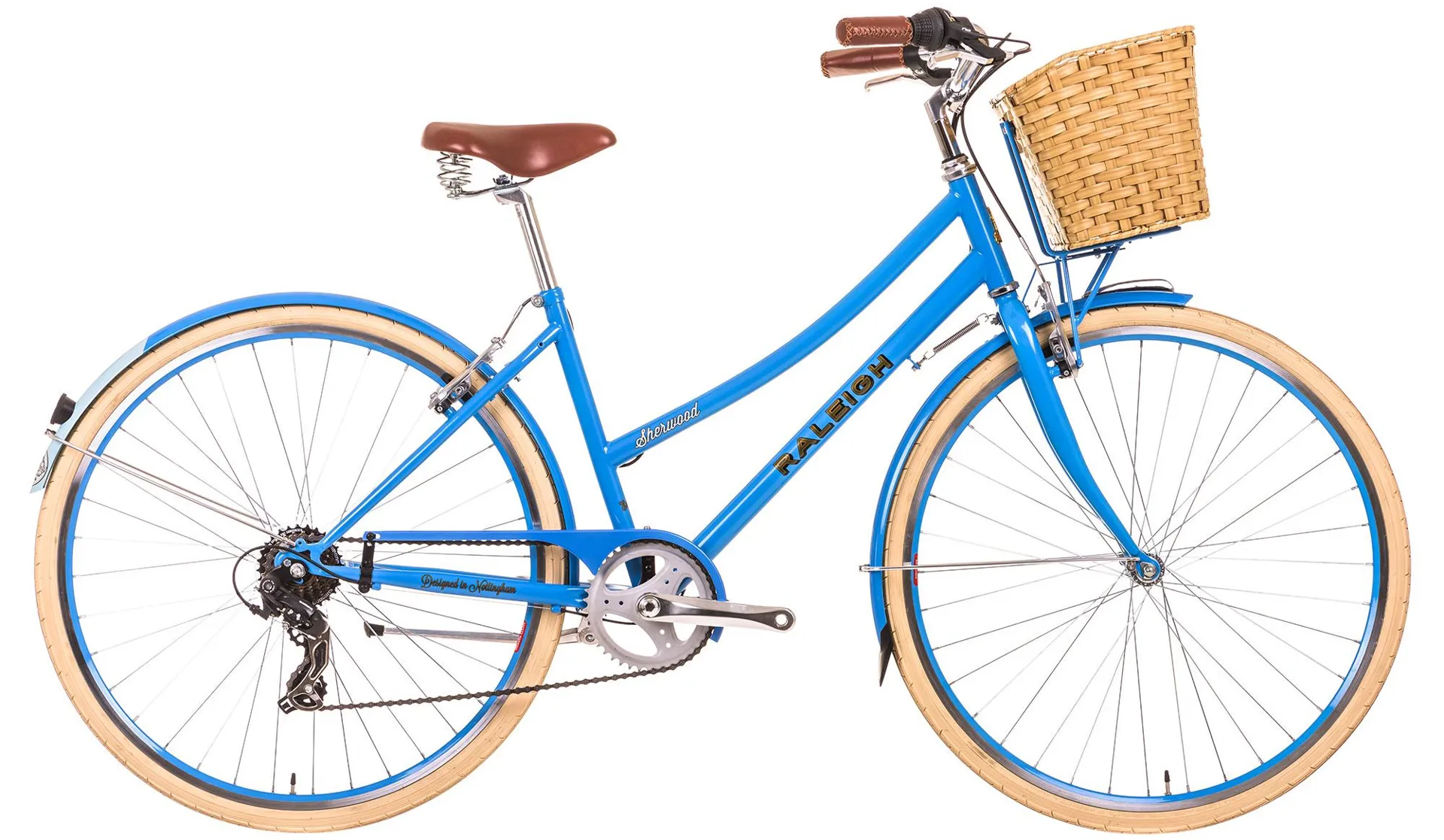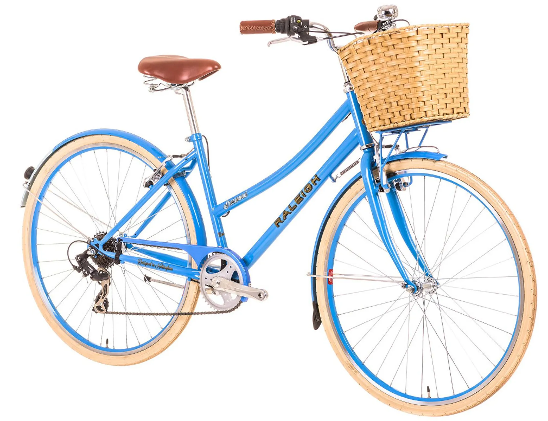 The Sherwood's graphics are inspired by Raleighs heritage and humble beginnings in Nottingham and have been sealed under a clear, protective lacquer to make sure your bike is kept pristine no matter where your travels take you. The beautiful imitation bamboo front basket is a must have accessory on this fashion inspired bike, ideal for transporting your shopping and designed to be durable. The Sherwood is a fully equipped bicycle boasting beautiful two-tone finish colour matched mudguards, an aluminium propstand, and a traditional ding dong bell included for safety and style.
