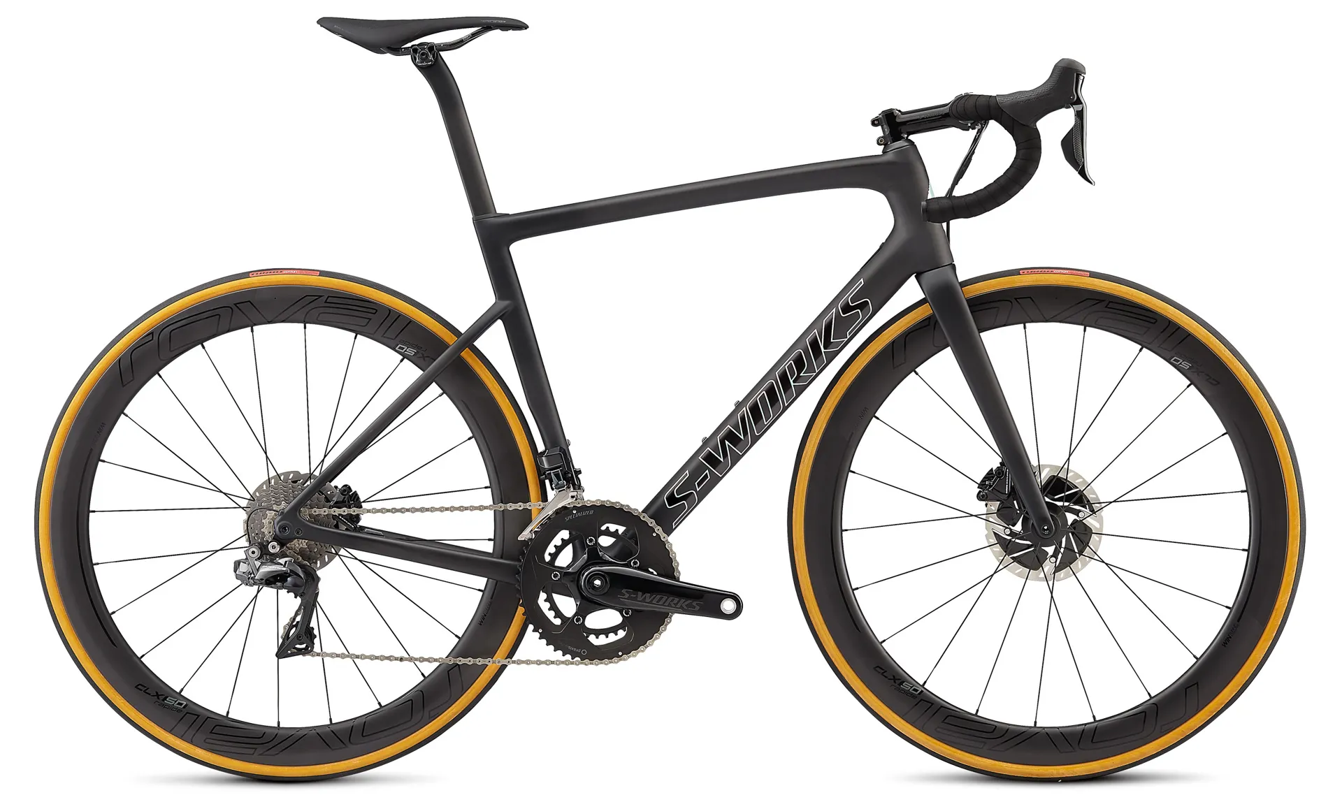 This S-Works Tarmac Disc comes ready to race with Shimano's new Dura-Ace 9170 Di2 groupset with disc brakes, and the lightweight, yet impressively aerodynamic, Roval CLX 50 Disc wheels with 26mm Turbo Cotton tires.