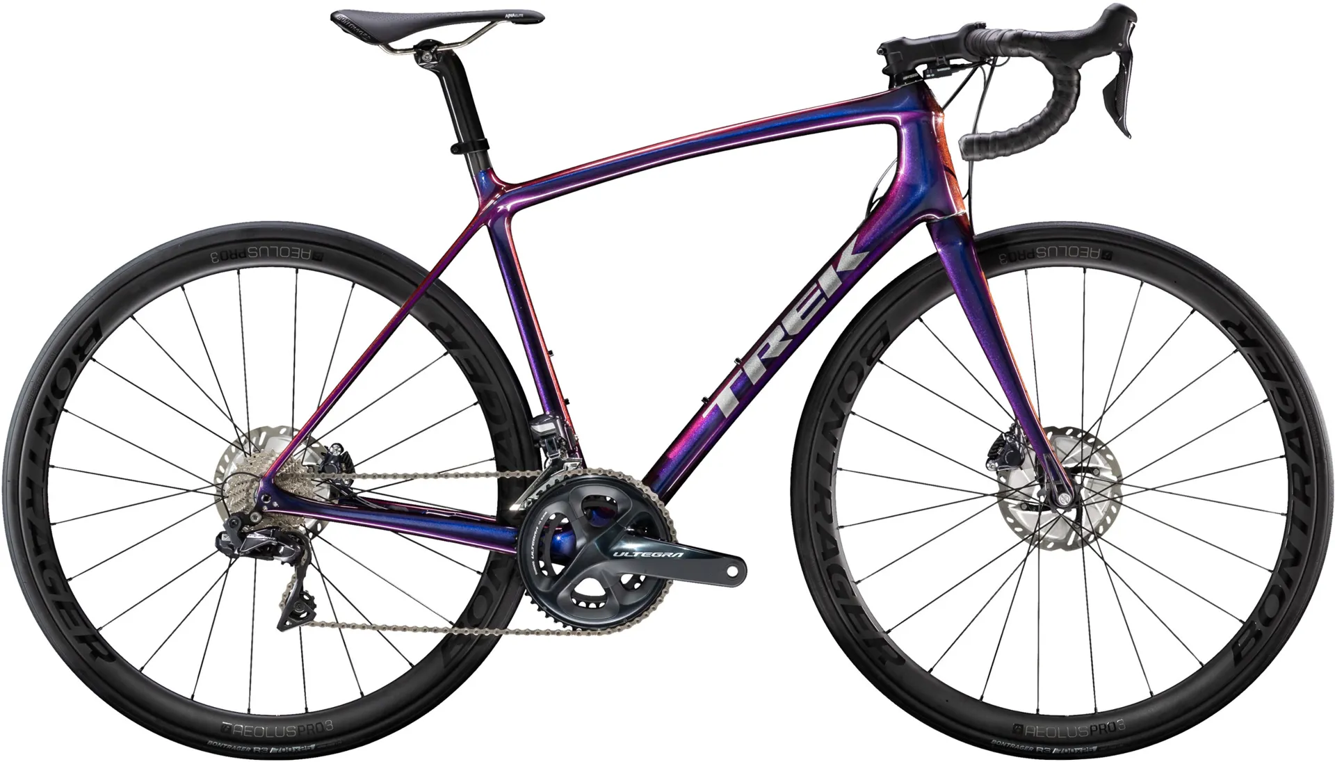 The lightest 700 Series OCLV Carbon road frame Trek have ever made, front and rear 12 mm thru axles, a full 2x11 Shimano Ultegra Di2 electronic drivetrain, Bontrager Aeolus Pro 3 carbon wheels, Shimano Ultegra flat mount hydraulic disc brakes, a Bontrager Pro IsoCore carbon handlebar and a Bontrager Ajna Elite saddle.