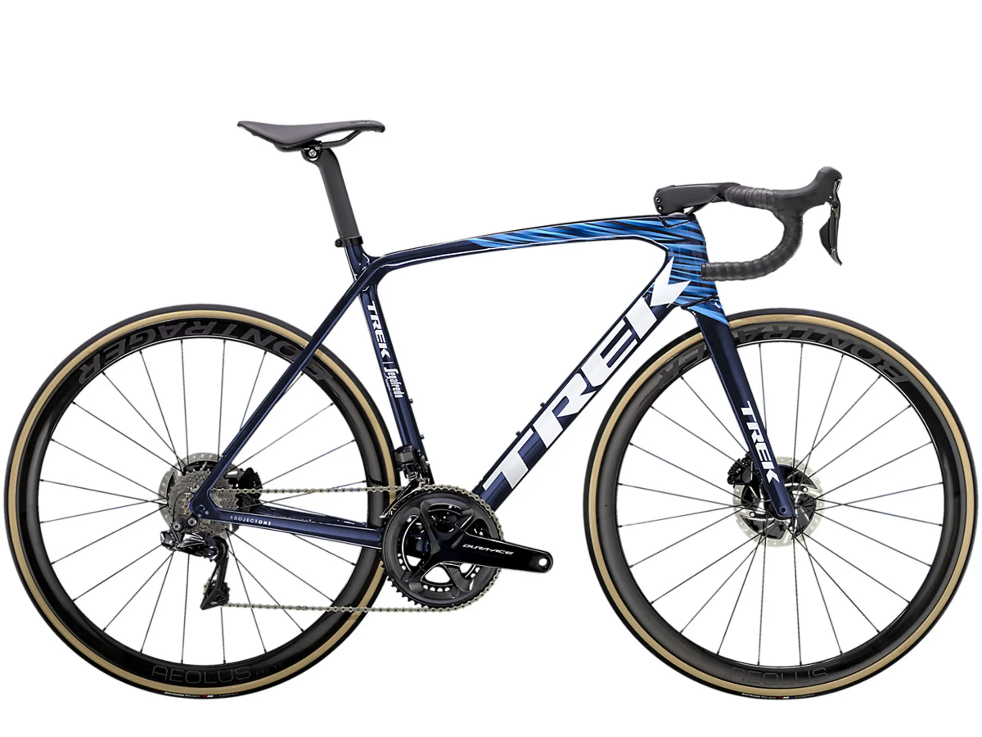 An ultralight and aerodynamic 800 Series OCLV Carbon frame that weighs under 700 grams, a 2x11 Dura-Ace Di2 electronic drive train, ultra-light, fast and stable Bontrager Aeolus RSL 37 OCLV Carbon tubeless-ready wheels, an Aeolus RSL OCLV Carbon integrated aero bar/stem and powerful hydraulic disc brakes.
