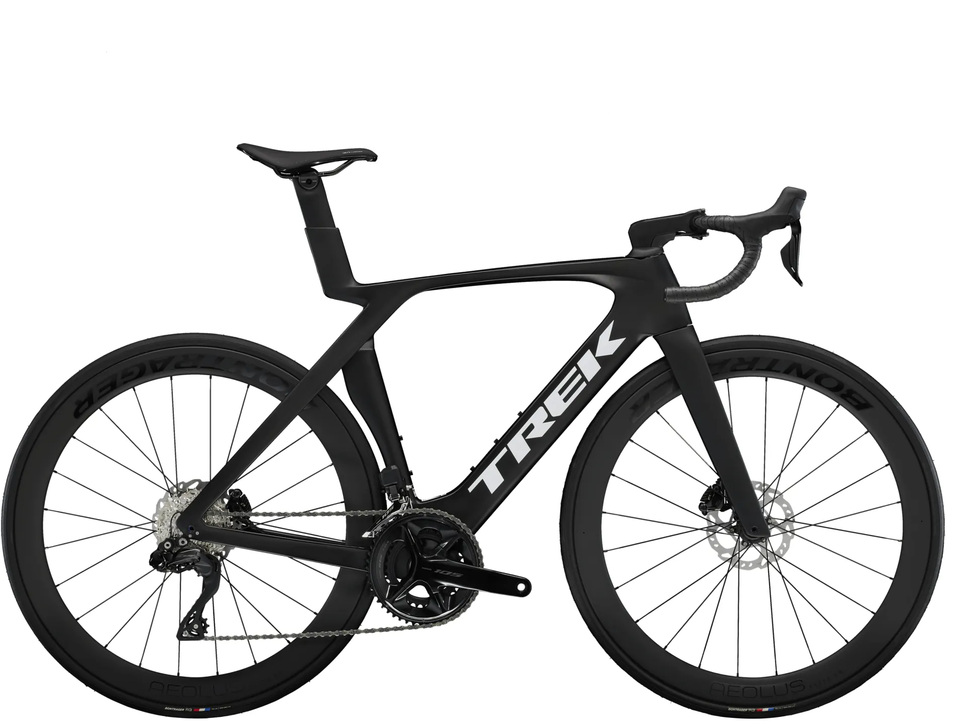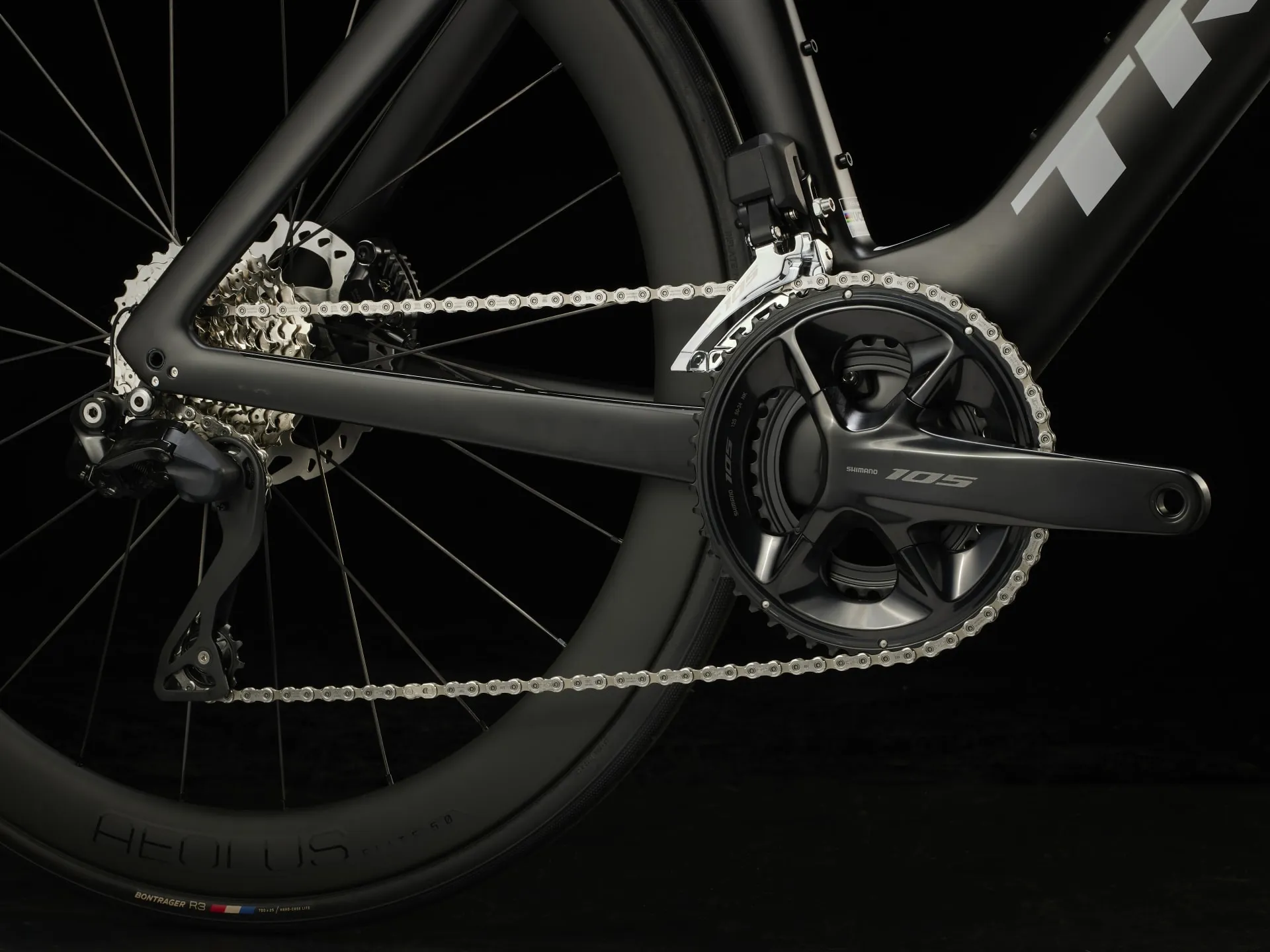 A 500 Series OCLV Carbon frame with aero Kammtail tube shaping and revolutionary IsoFlow seat tube, invisible routing, a super fast Shimano 105 Di2 12-speed electronic drivetrain, Bontrager RSL Aero OCLV Carbon handlebars, and Bontrager Aeolus Elite 50 tubeless-ready carbon wheels.