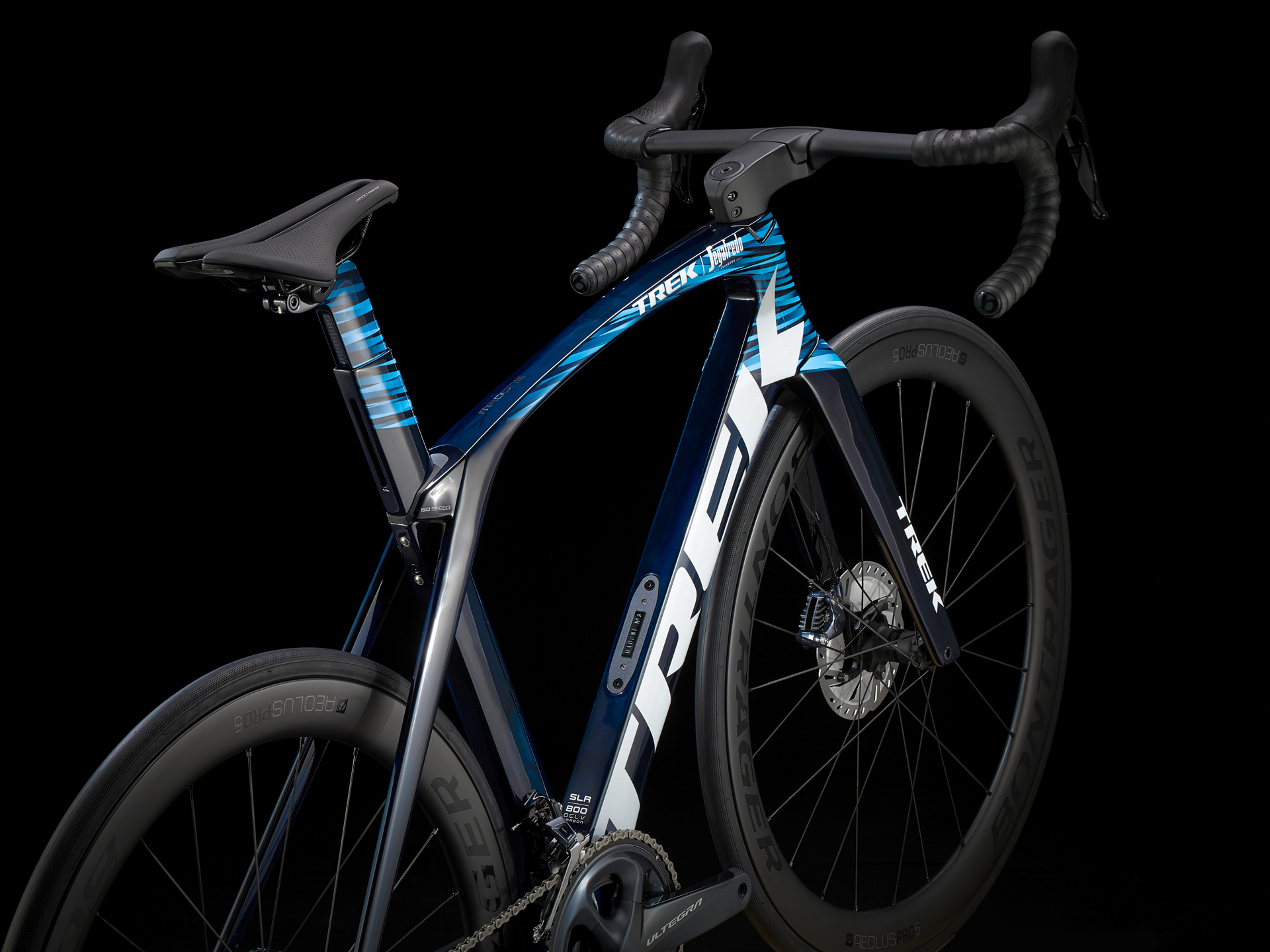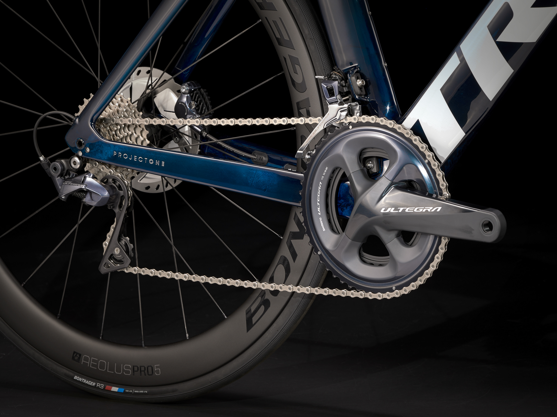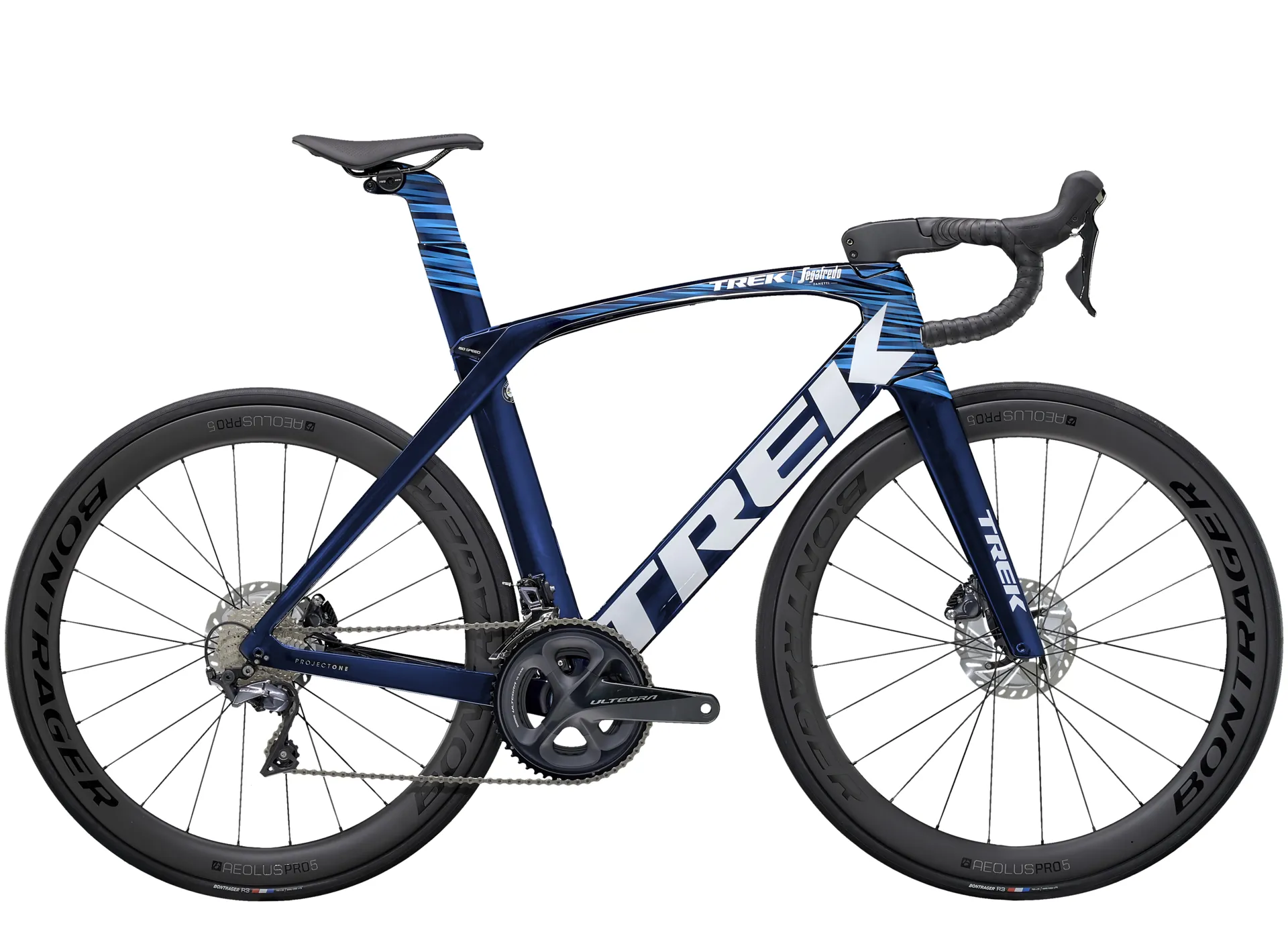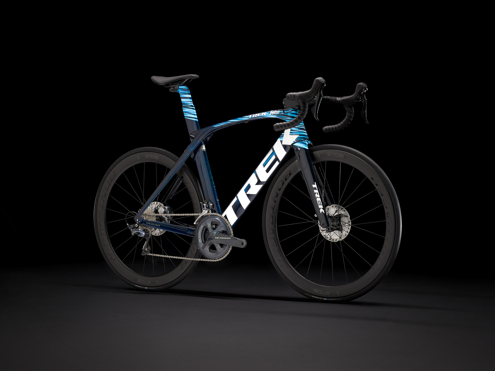Our lightest-ever 800 Series OCLV Carbon frame with Kammtail Virtual Foil aerodynamic tube shaping and road-smoothing Adjustable Top Tube IsoSpeed, KVF full carbon disc fork, an adjustable aero bar and stem, a 2x11 Shimano Ultegra drive train, Tubeless Ready Bontrager Aeolus Pro 5 Disc wheels, a Madone aero carbon seat mast and Shimano Ultegra flat-mount hydraulic disc brakes.