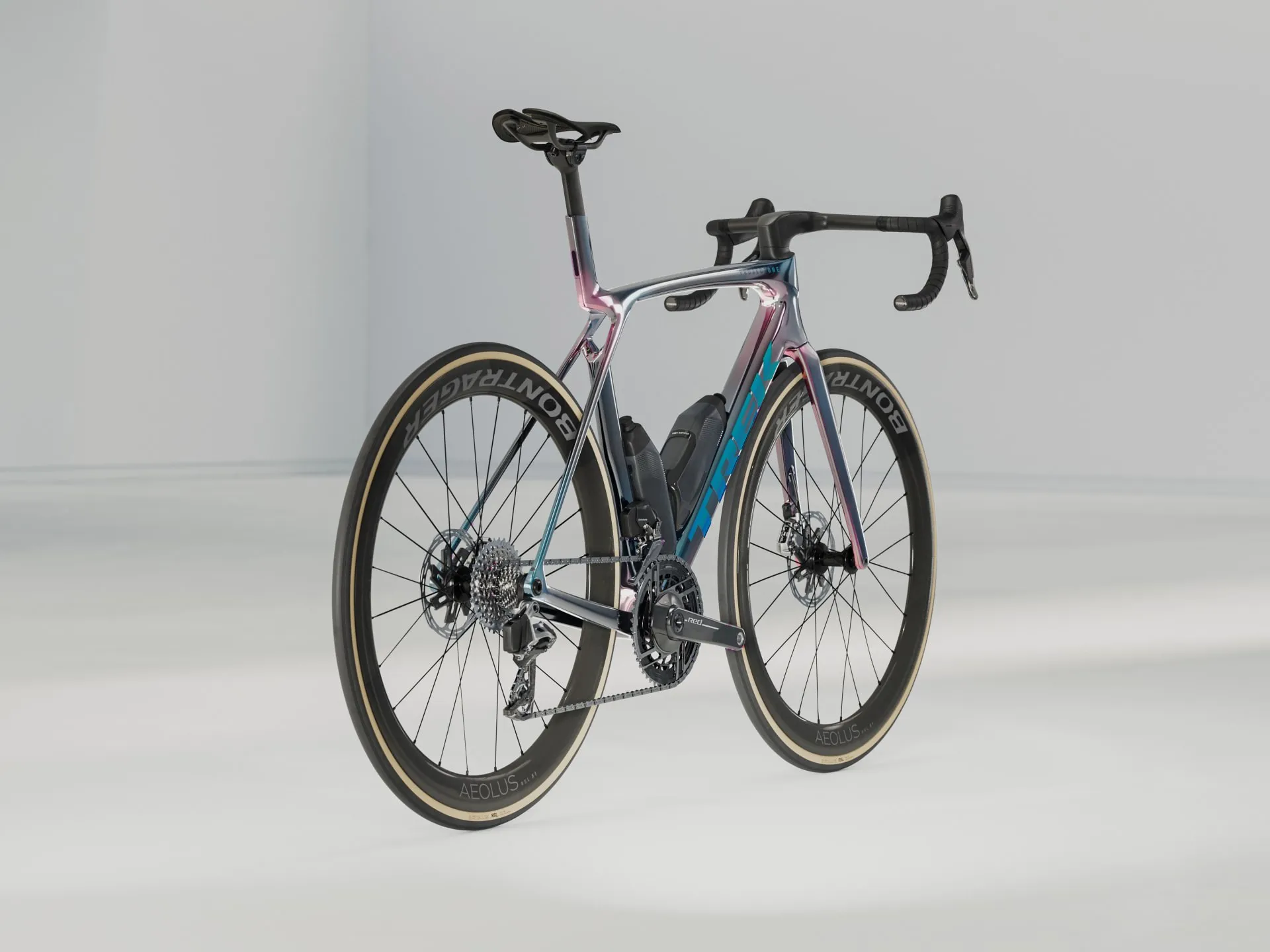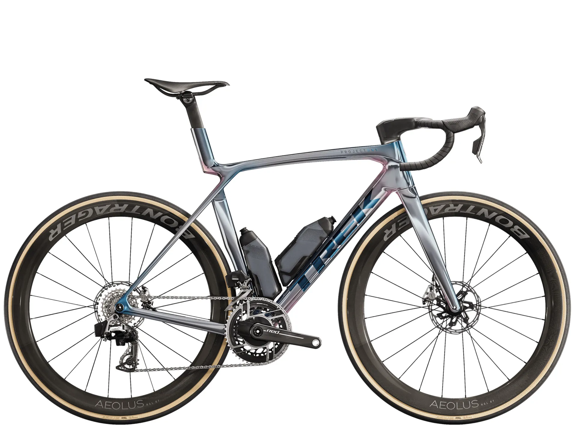 An insanely light frame made of our highest-level 900 Series OCLV Carbon with aero tubing, IsoFlow comfort technology and RSL Aero Bottles and Cages that save watts. SRAM's latest RED AXS E1 ultra-light drivetrain and power meter for training with data. A universal derailleur hanger so you can get a replacement from anywhere. Plus, it's topped off with Bontrager Aeolus RSL 51 tubeless carbon wheels and a Trek Aero RSL one-piece bar/stem.