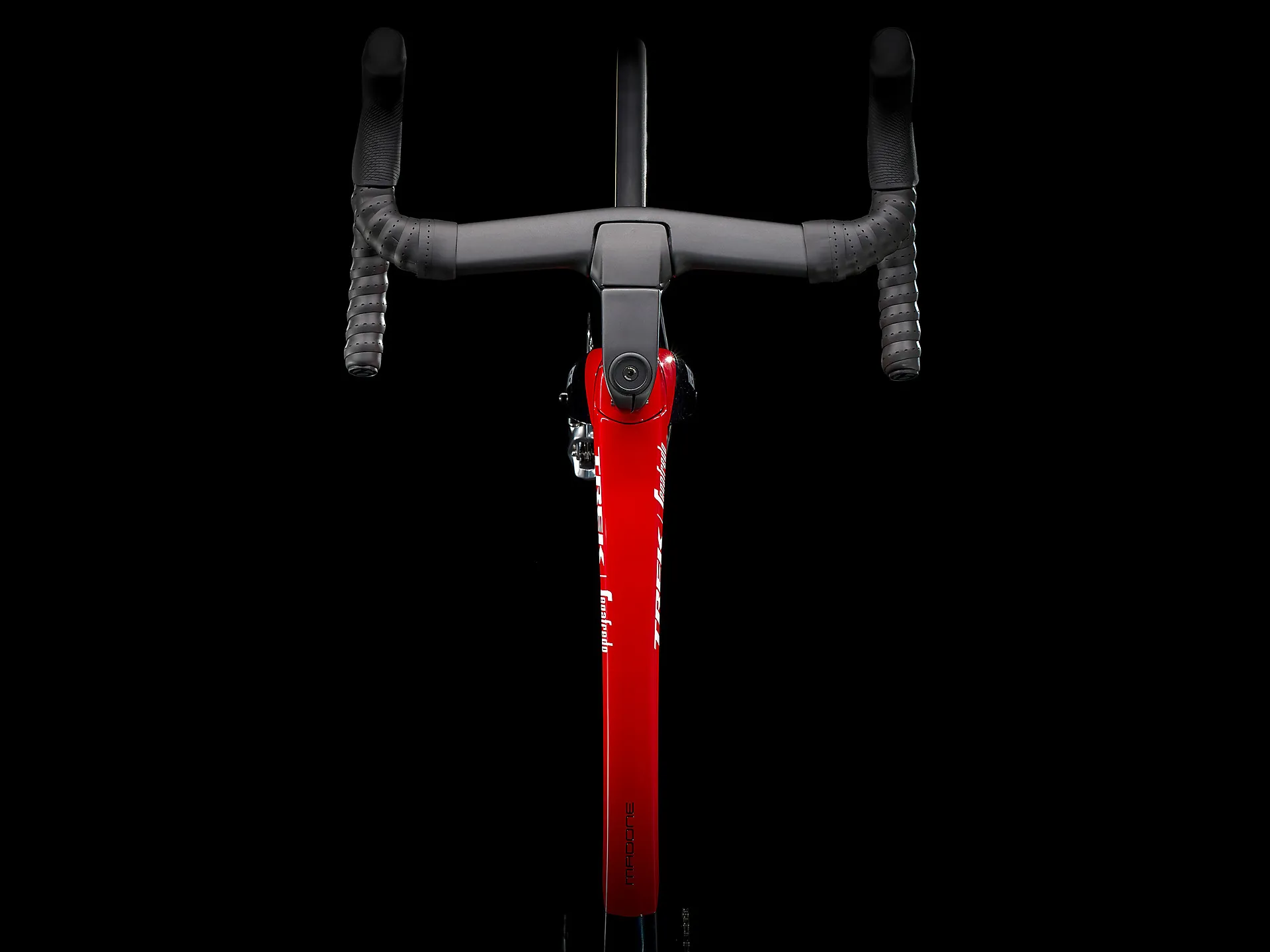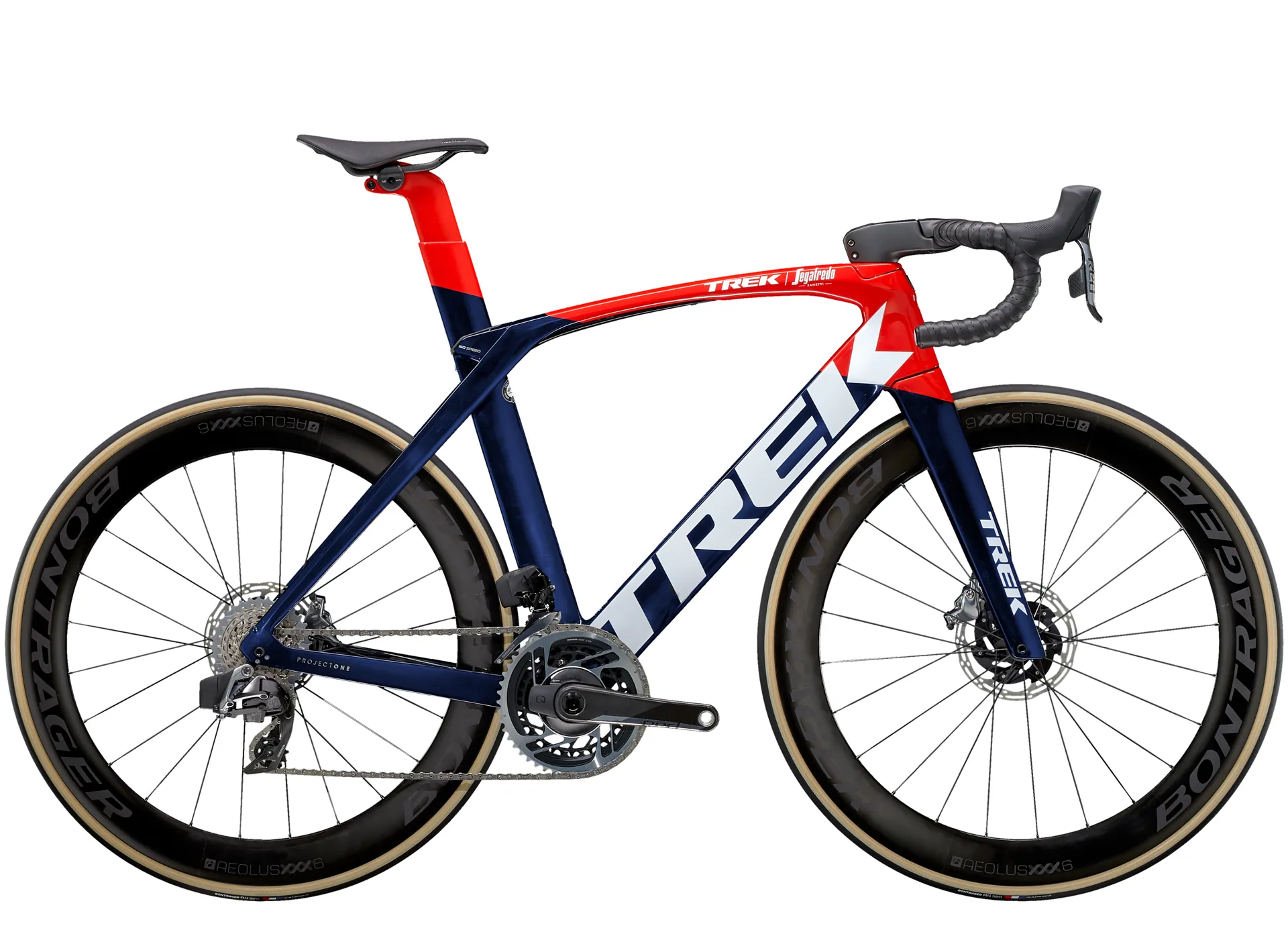 Our lightest-ever 800 Series OCLV Carbon frame with Kammtail Virtual Foil aerodynamic tube shaping and road-smoothing Adjustable Top Tube IsoSpeed, KVF full carbon fork, an adjustable aero bar and stem, a 2x12 SRAM RED eTap AXS wireless electronic drive train, Tubeless Ready Bontrager Aeolus XXX 6 wheels, a micro-adjust Madone seat mast and RED flat-mount hydraulic disc brakes.