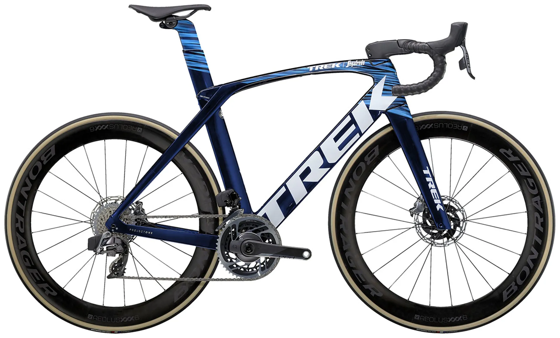Our lightest-ever 800 Series OCLV Carbon frame with Kammtail Virtual Foil aerodynamic tube shaping and road-smoothing Adjustable Top Tube IsoSpeed, KVF full carbon fork, an adjustable aero bar and stem, a 2x12 SRAM RED eTap AXS wireless electronic drive train, Tubeless Ready Bontrager Aeolus XXX 6 wheels, a micro-adjust Madone seat mast and RED flat-mount hydraulic disc brakes.