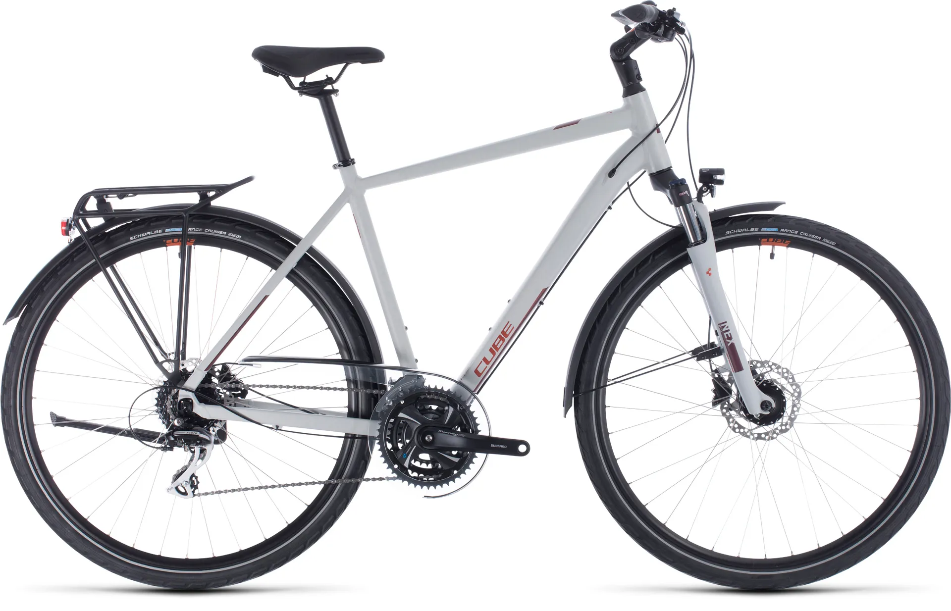 The heart of the Touring is its high-quality, low-weight, double-butted aluminium frame. Designed with CUBE's Efficient Comfort Geometry to be comfortable and efficient for long days in the saddle, it'll surprise you with its nimble and easy handling. The Easy Entry version is sleek and easy to use, with the best possible access for easy mounting and dismounting. There's also a sporty-looking trapeze frame, while the men's classic diamond frame's five sizes mean you're assured of finding the perfect fit for you. Every frame features their exceptionally neat luggage carrier and cables routed inside the down tube, which keeps the looks svelte and ensures that your gears will keep shifting smoothly for longer. And, of course, we remembered to leave space for water bottle mounts for those long excursions into the countryside ... so you can just enjoy the ride.