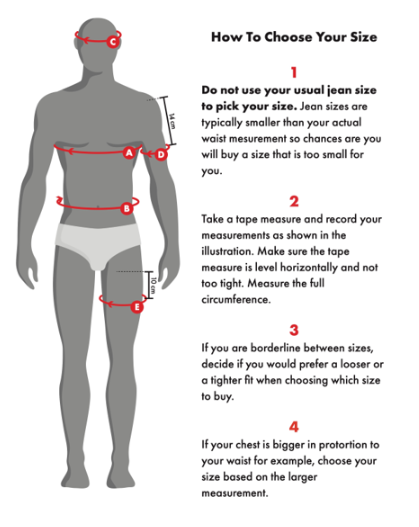 | Chest (cm) | 89 – 94cm | 94 -99cm | 99-104cm | 104 – 109cm | 109 – 114cm | 114 – 119cm |