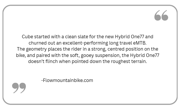 Now lets focus on the Cube ONE77. This bike is built for riders who want more power and confidence when the trail gets quick, steep and tough. With extra suspension travel, the ONE77 helps you stay in control on challenging descents and more technical terrain. The electrical motor gives you a strong support on the climbs, so you can focus more on riding harder and pushing your limits.