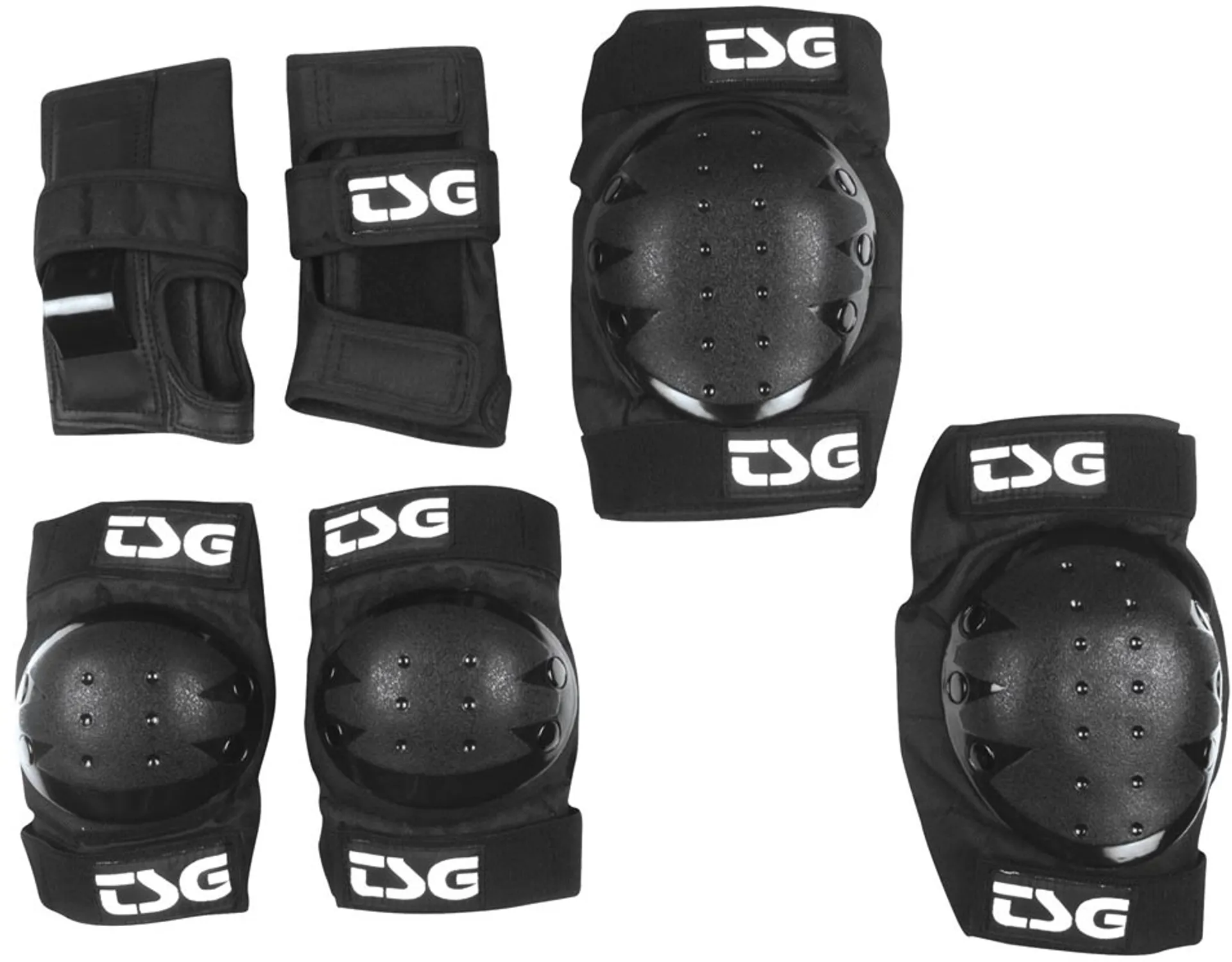 The TSG Junior Basic Padset. This all-in-one skate protection set includes a set of knee pads, elbow pads and wrist guards for beginners and bargain hunters.