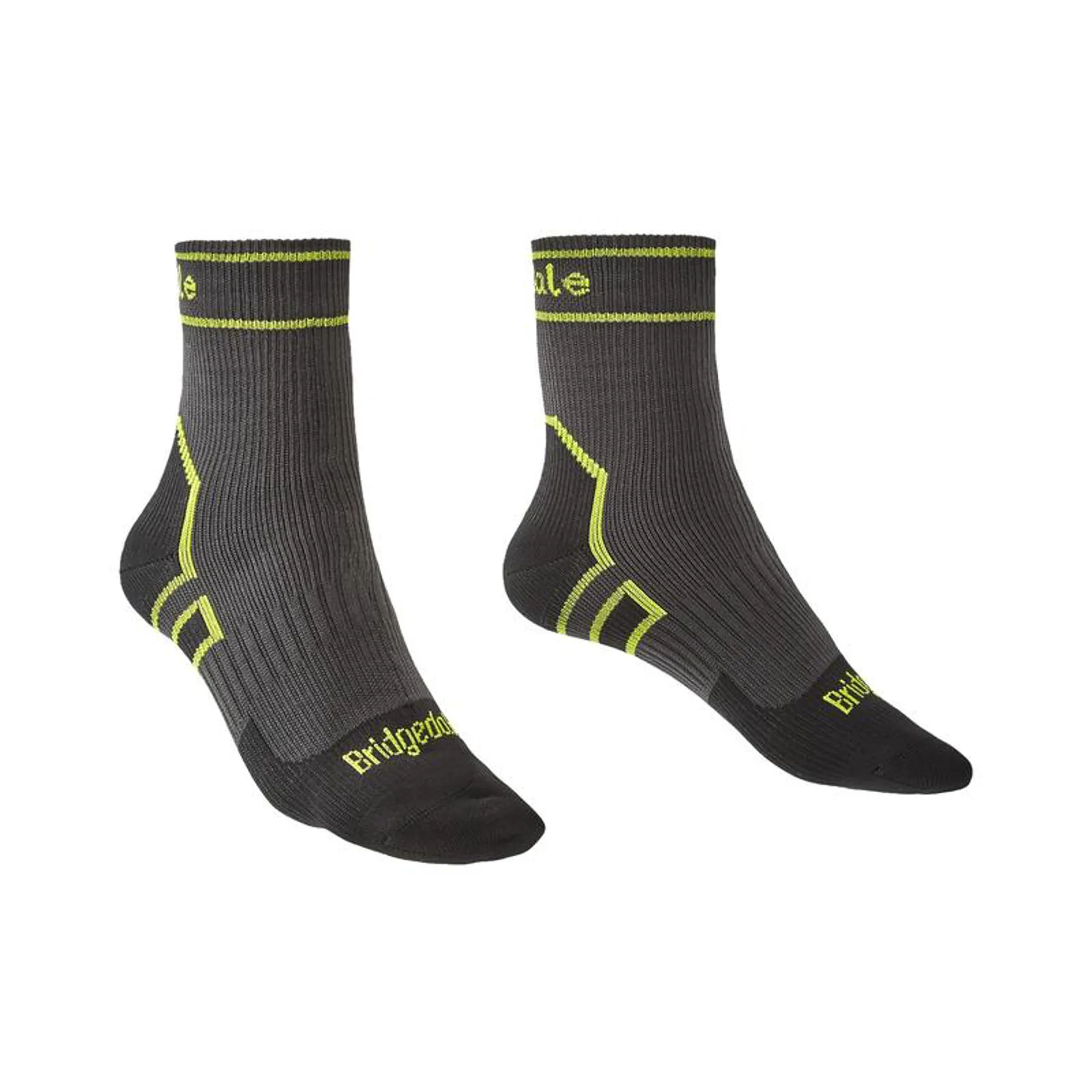 Designed to fit just a few cm's above the ankle bone these socks feel light and unrestrictive and prevent heat building up in the lower legs, perfect for trail running or walking on wet ground sodden ground in dryer weather conditions. Due to their length, in extended wet weather, it can prove difficult to prevent water ingress, if your after walking in the rain try a boot or knee length Bridgedale StormSock