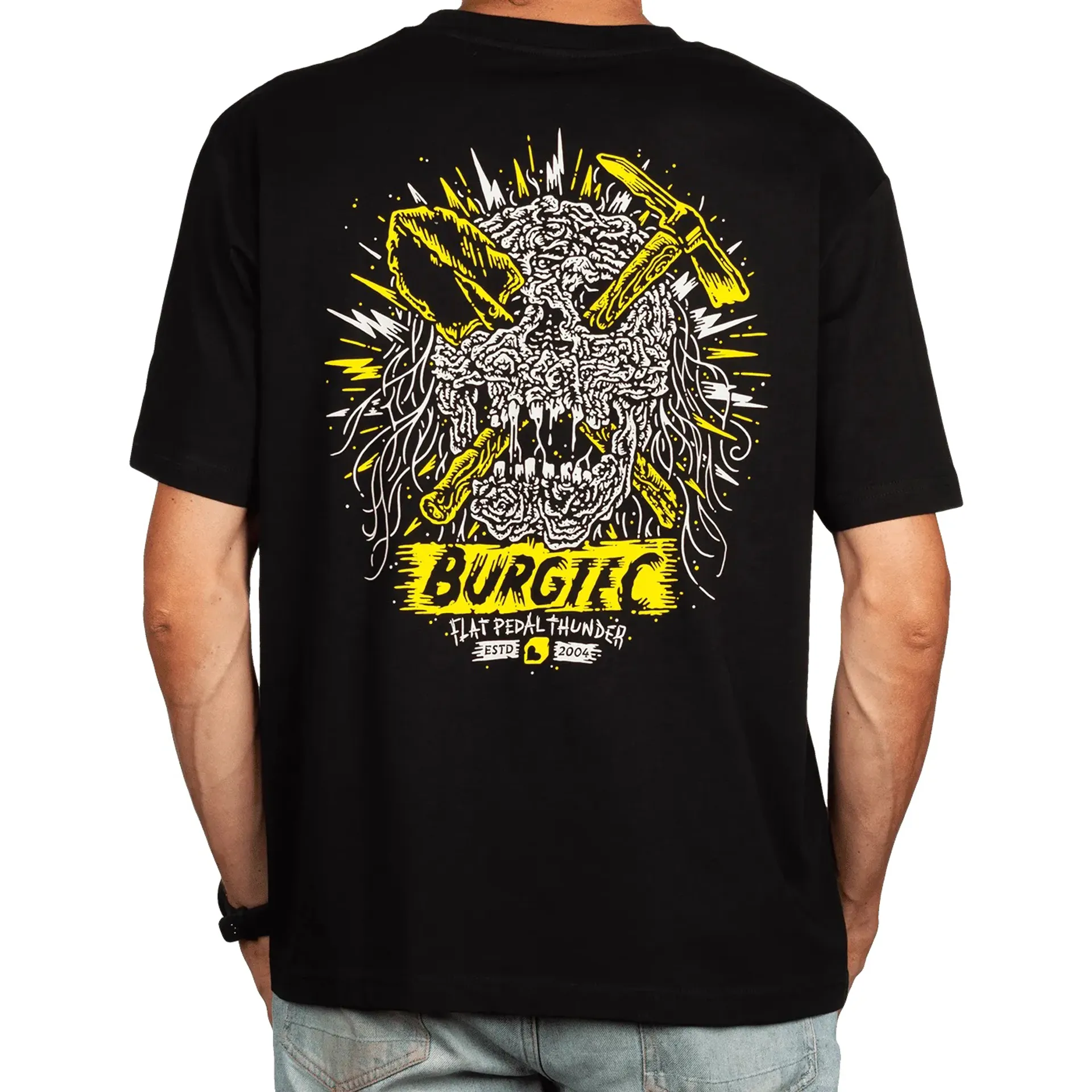 The Burgtec Skull SS Tee harks back to the classic Skull Hardware Tee with a bit of Flat Pedal Thunder thrown in for good measure.