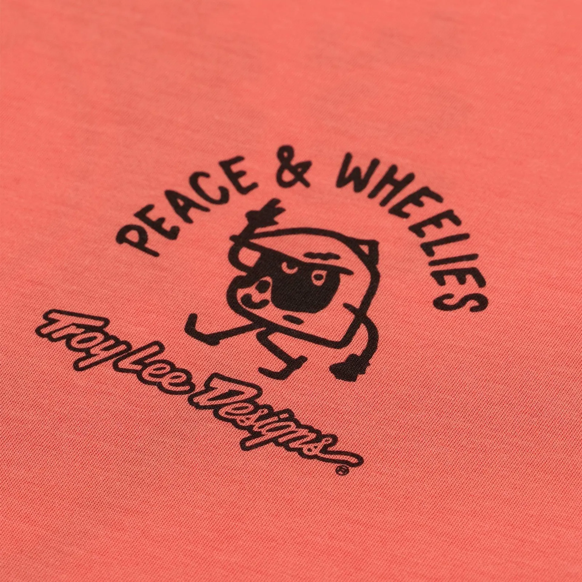 The Skyline Ride Youth Short Sleeve Ride Jersey, with its striking melon colour and fun Peace & Wheelies branding, is perfect for young riders who value comfort on all-day explorations.