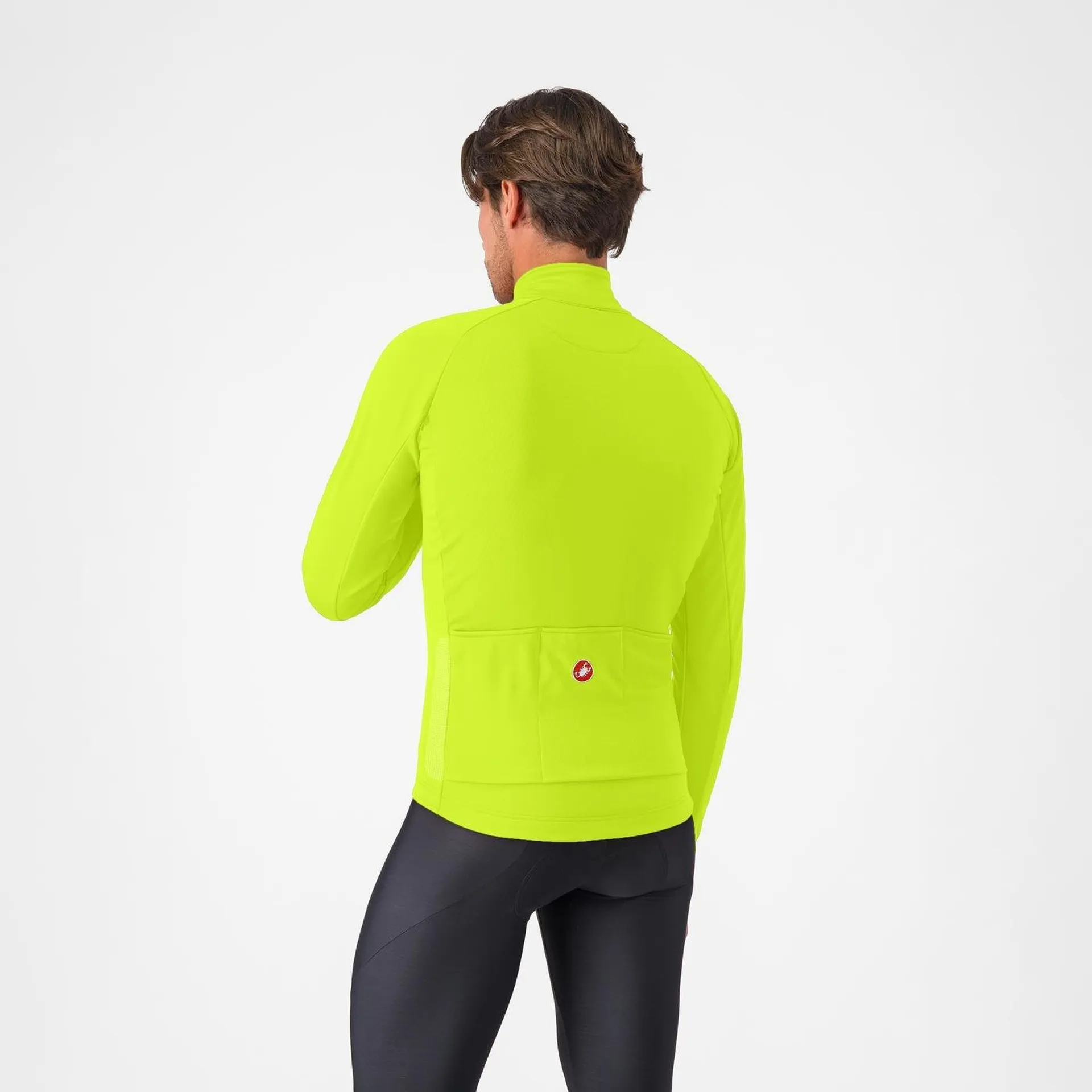 Part of the technology comes from the Polartec® AirCore™ fleece-lined 298 g fabric. It’s exceptionally warm, with a micro grid inside that traps air for insulation, and fully windproof. It’s also exceptionally breathable, with 0.7 CFM air permeability that’s unmatched in fabrics providing over 5,000 mm hydrostatic head rain protection and it’s PFAS-free and made from recycled PET. The other part of the technology comes from Castelli’s construction, with two-way stretch for a perfect fit in the riding position, a fleece-lined collar, a YKK® Vislon® zipper providing the easiest on-the-fly adjustment, and 360° reflective bits for visibility.