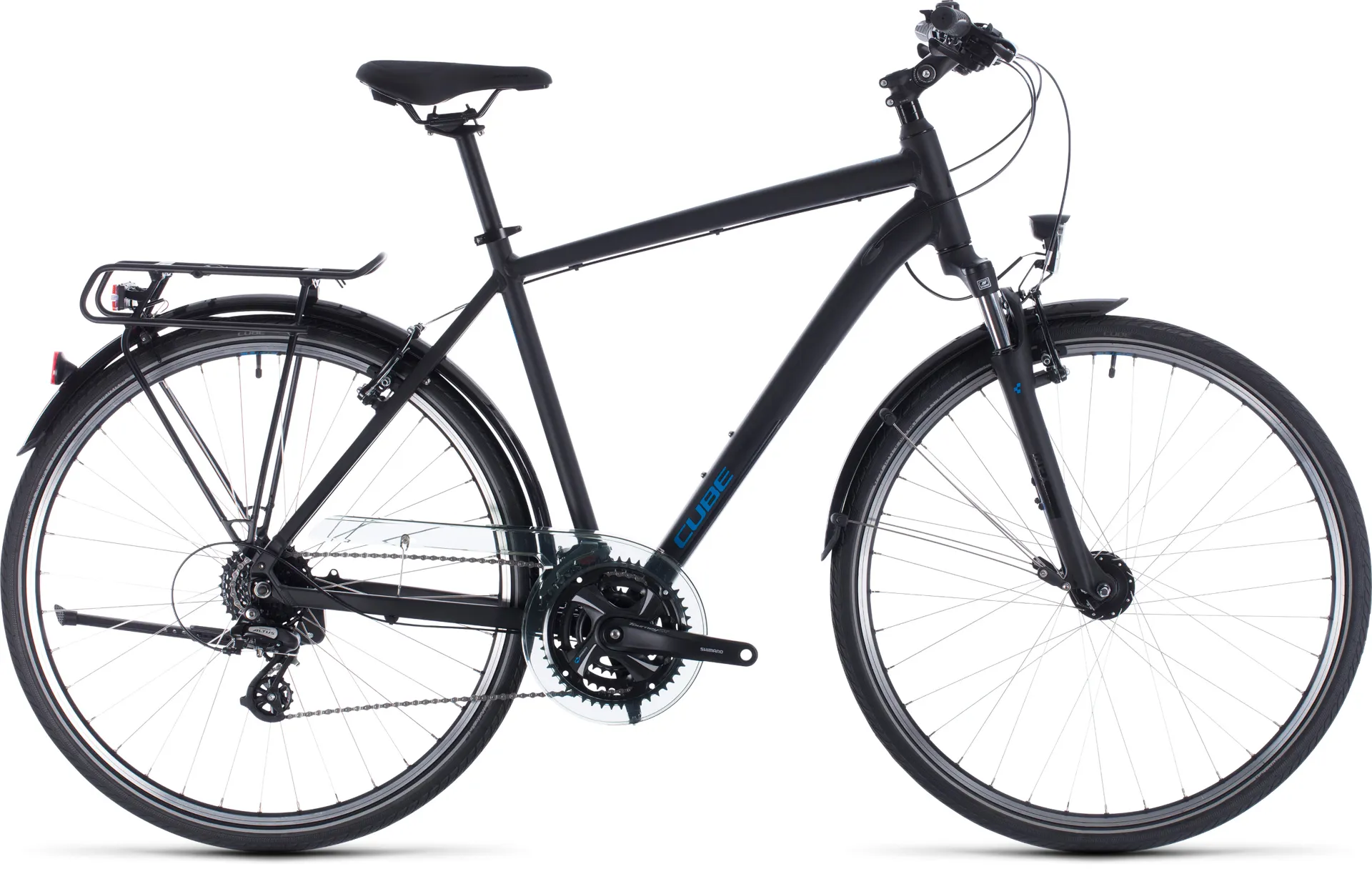 When the open road beckons, you'll need a bike that's comfortable, versatile, safe and fun to ride. The CUBE Touring ticks all the boxes, combining a lightweight aluminium frame with all the features you need to enjoy your cycling. And, because it's available in three different frame configurations - Easy Entry, Trapeze, and classic Men's - there's one to suit every rider. Our Efficient Comfort Geometry ensures that you'll be comfortable and in full control, even on the longest rides, and you can rest assured that our in-house test lab has verified the strength, durability and safety of the frame and all the components. Finishing touches like internally routed cables and ultra-neat rack and mudguard mounting points demonstrate the attention to detail that goes into every CUBE frame. Slick-shifting Shimano gears, easy-to-use rim brakes and a comfort-enhancing suspension fork all add to the appeal, while a full complement of essential accessories means that your CUBE Touring is ready to take on any journey. The only remaining question is, where will it take you tomorrow?