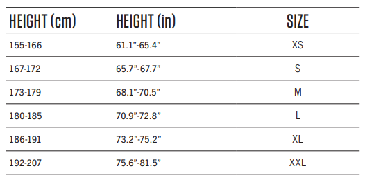 ranging from XS to XXL.