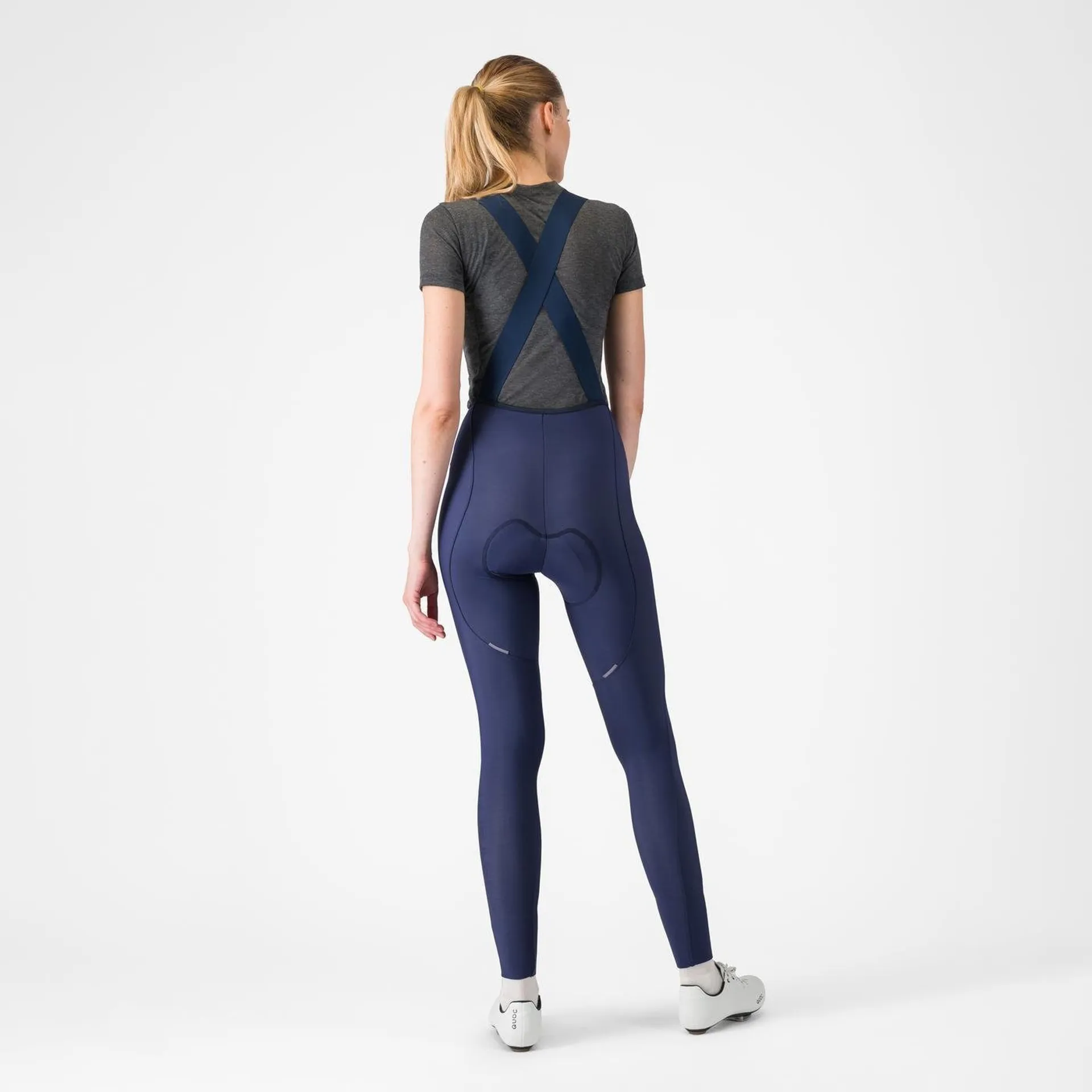 Thermoflex fabric is used throughout the tight for warmth, stretch, and comfort with seams placed to avoid irritation. The ankles are also a zipperless construction to prevent irritation and with this, it cuts down added bulk when you wear a shoecover. Castelli have used the stretch bib straps from the Espresso W DT Bibshort to make sure everything stays in place while keeping you from overheating. The Drop Tail bib construction also makes nature breaks easier and The Progetto X2 Air Seamless Donna seat pad keeps you comfortable over long winter miles.