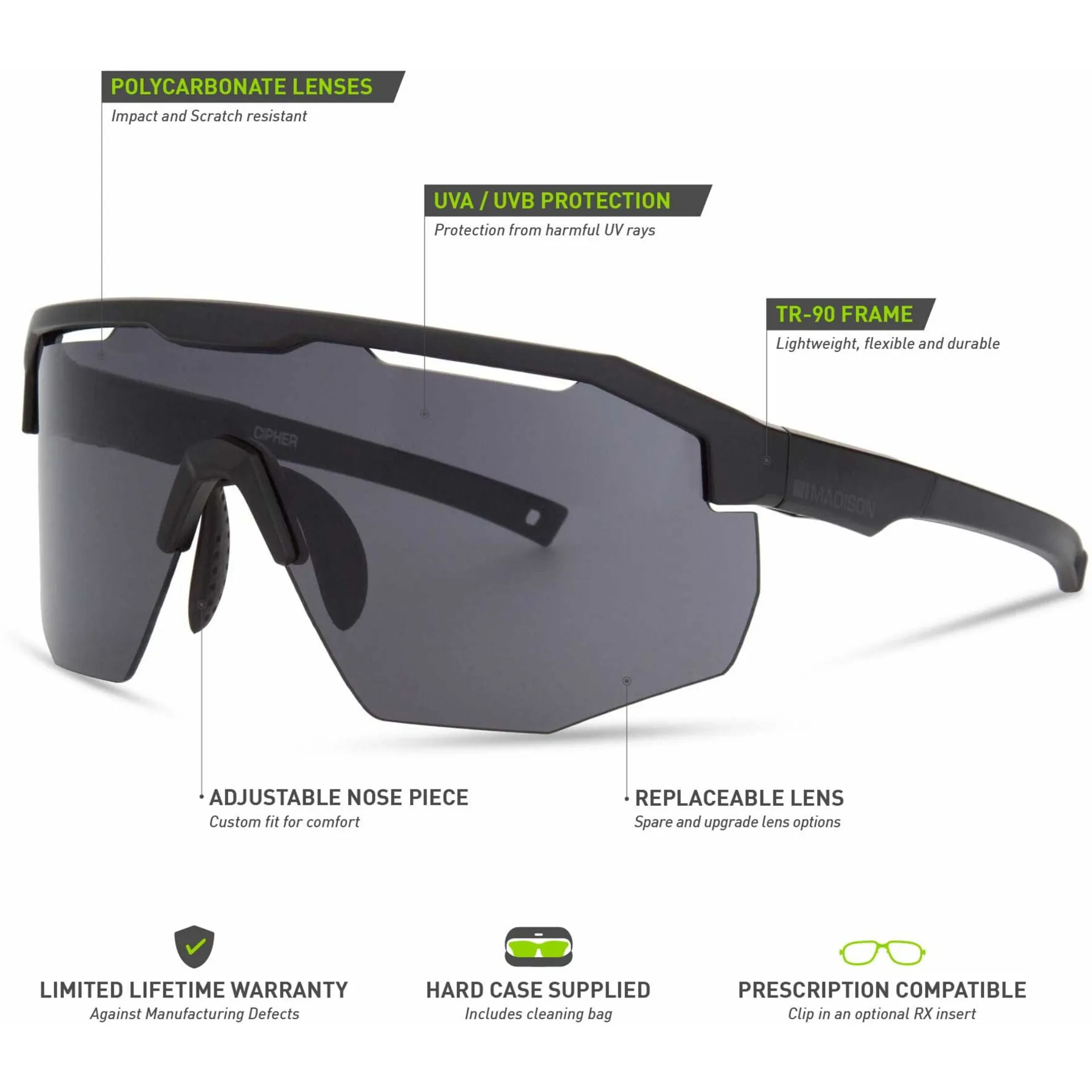 • Polycarbonate Lenses: Optics from Madison meets the highest standard for eyewear; ISO 12312. The interchangeable polycarbonate lenses are both impact and scratch-resistant. The lenses offer both supreme optical clarity and UV-A and UV-B protection