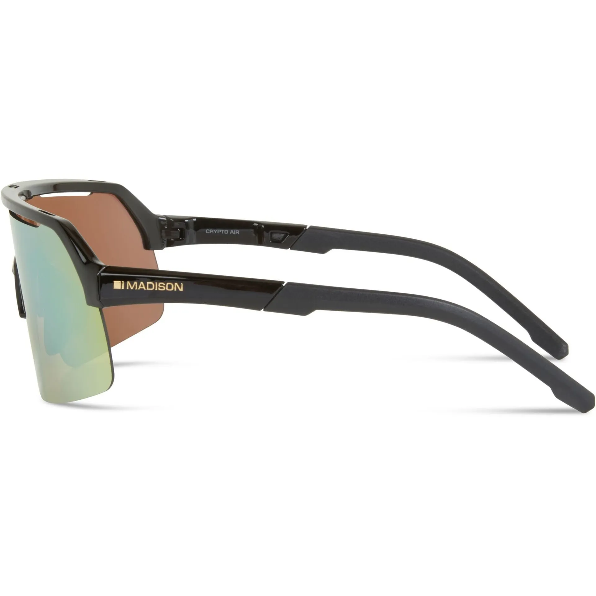 The Madison Crypto Air Sunglasses Gloss Black/Bronze Mirror Lens, with expansive yet lightweight Crypto Air design, available now at Leisure Lakes Bikes.