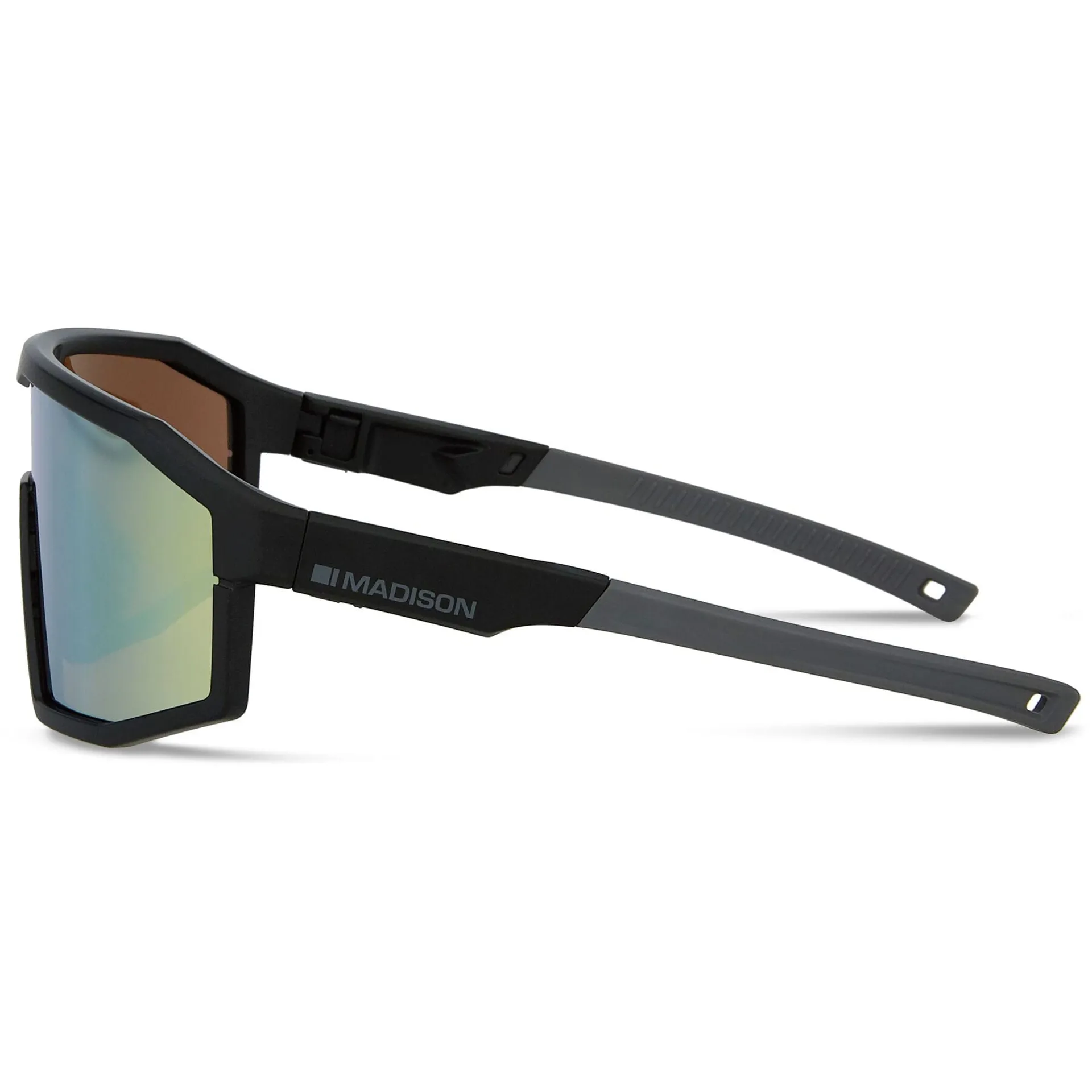 The Madison Enigma Sunglasses frame offers a huge field of vision and protection. With an adjustable nose piece and temple tips, it tailors to fit all face shapes and stays firmly in place when you're rattling along any technical terrain.