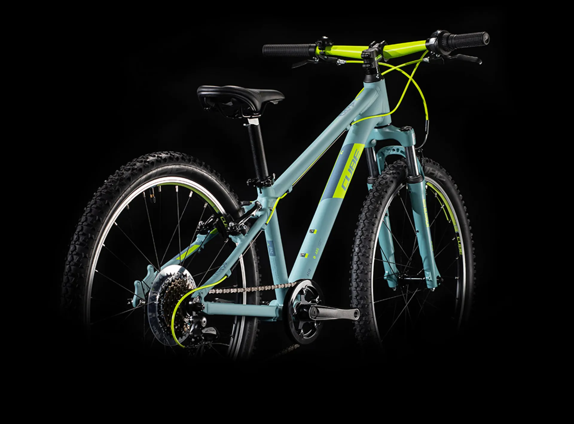 That's because, when Cube's engineers set out to design it, they began with the same heat-treated 6061 aluminium tubes that we use in our adult frames. The result is a frame that's every bit as durable as a full-size mountain bike, but with the right weight and proportions for a child. Mechanically formed tubes mean that it's bang up to date in terms of technology, too. The geometry is tailored to the needs of young riders, so it's stable and easily controllable with a low top tube to improve confidence and safety - and the replaceable gear hanger ensures that an accidental knock needn't result in an expensive repair. There's a Suntour suspension fork to improve comfort and control on rough surfaces, and Shimano 7-speed gears with Velo grip control bring every hill within reach. The V-brakes are powerful and easy to control, thanks to levers that are specially designed for small hands and a power modulator on the front. With a bike like this, there's nothing standing in the way of off-road adventures for your little riders...