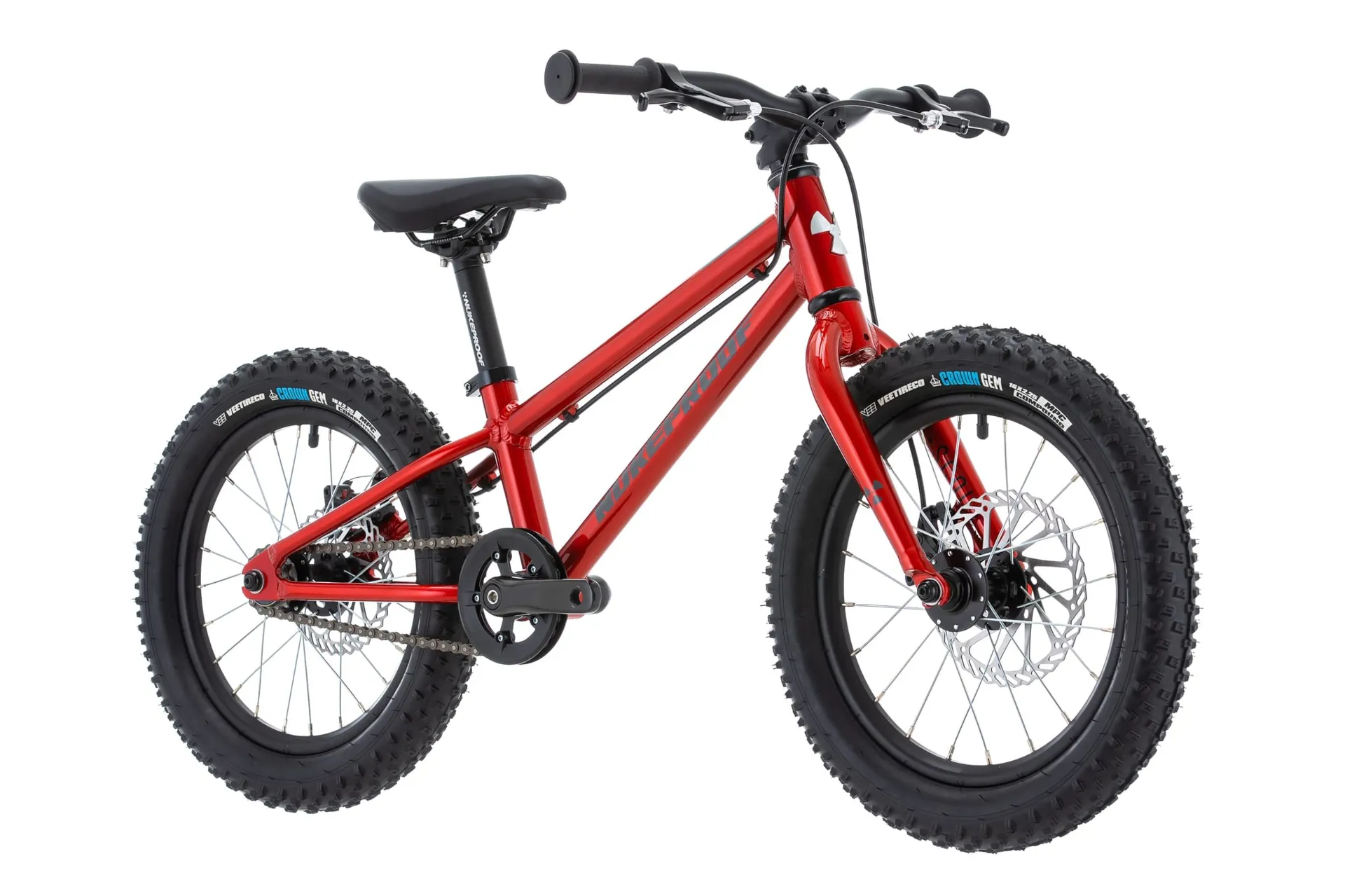Nukeproof's team of discerning testers (they're own kids) have high standards — single-speed gearing to keep things simple in those first pedalling days andshort-reach brake leversso even the smallest hands can engage the disc brakes when things get rowdy.