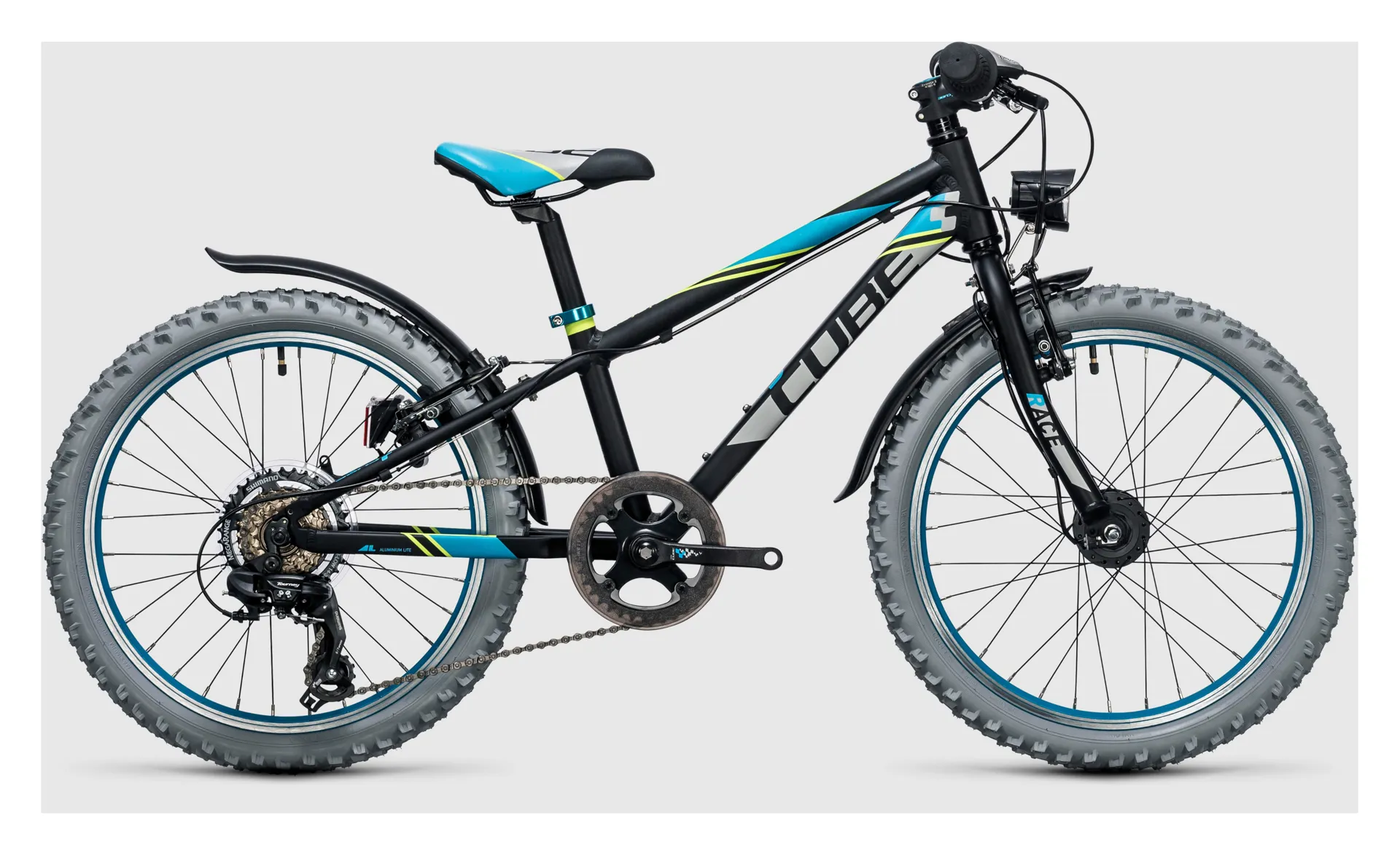 The Cube Kid 200 Allroad Boys Bike 2017 is just as cool as a real mountain bike, but with extra safety features including a permanently installed light system with hub dynamo, and detachable mudguards.