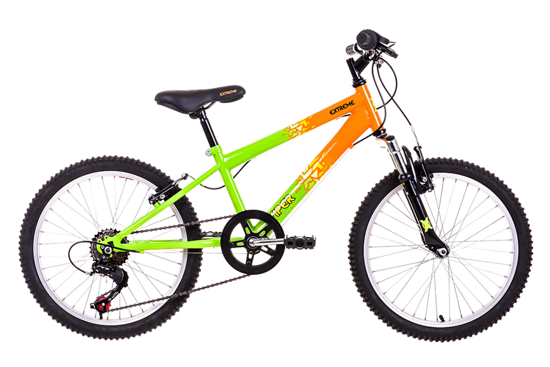 The Extreme Viper is ideal if you want a bike to get to the park, the shops or to school. Equipped with a front suspension fork, mountain bike tyres.