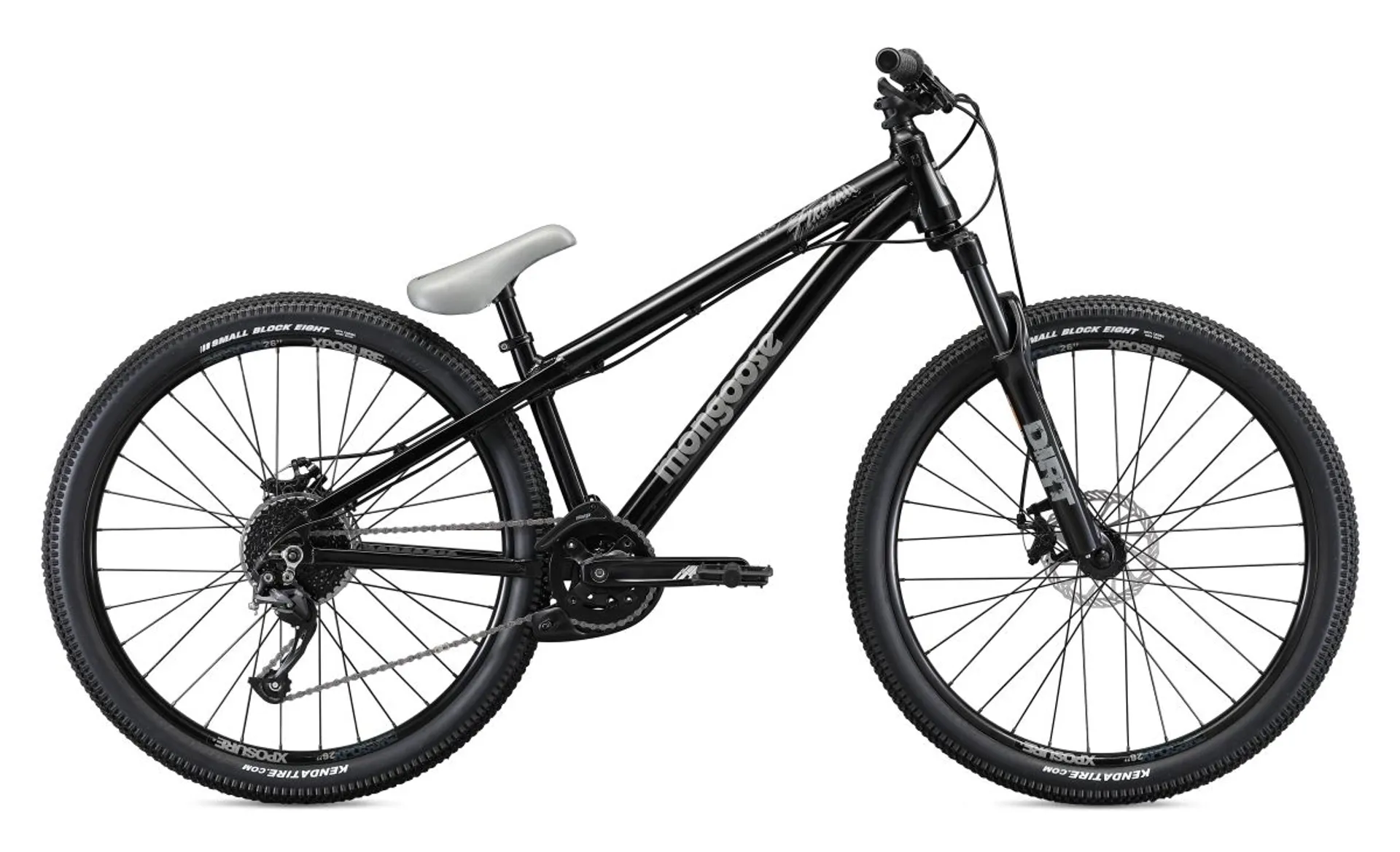 • Mongoose aluminum dirt jump frame featuring vertical drop outs and RST DIRT-T 100 mm travel fork.