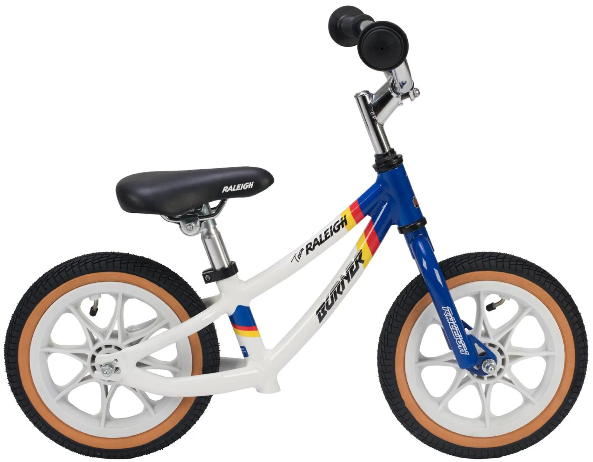 Designed in the famous Andy Ruffel Team Burner colours this balance bike comes complete with miniature versions of the iconic white SKYWAY Tuff2 wheels. Plus Raleigh have even included the traditional black tyres with tan sidewalls for true authenticity. You may have had a Team Aero Pro Burner when you were younger and now your little cyclist can enjoy one. With a matching Burner helmet, your kid will be the coolest on the street!