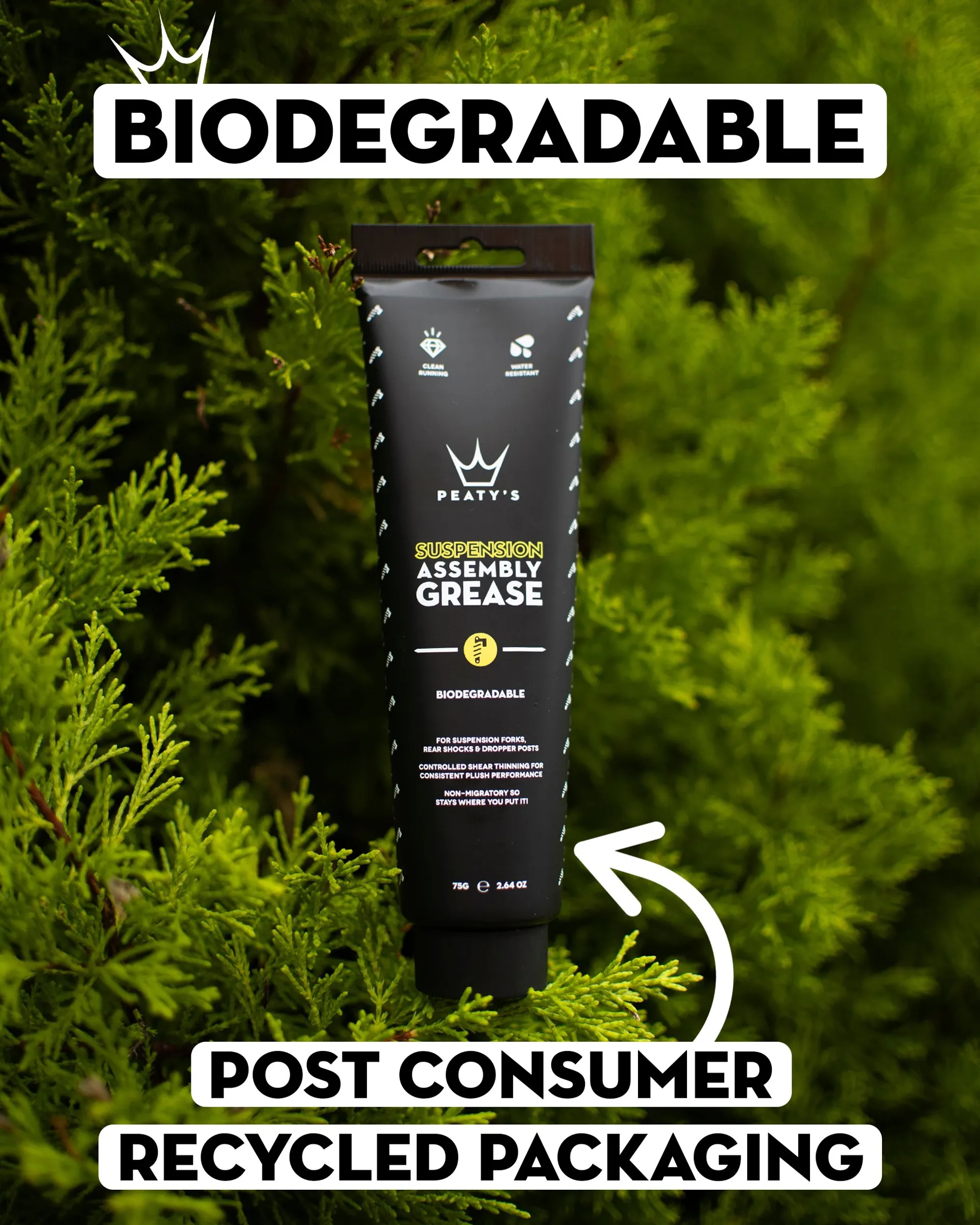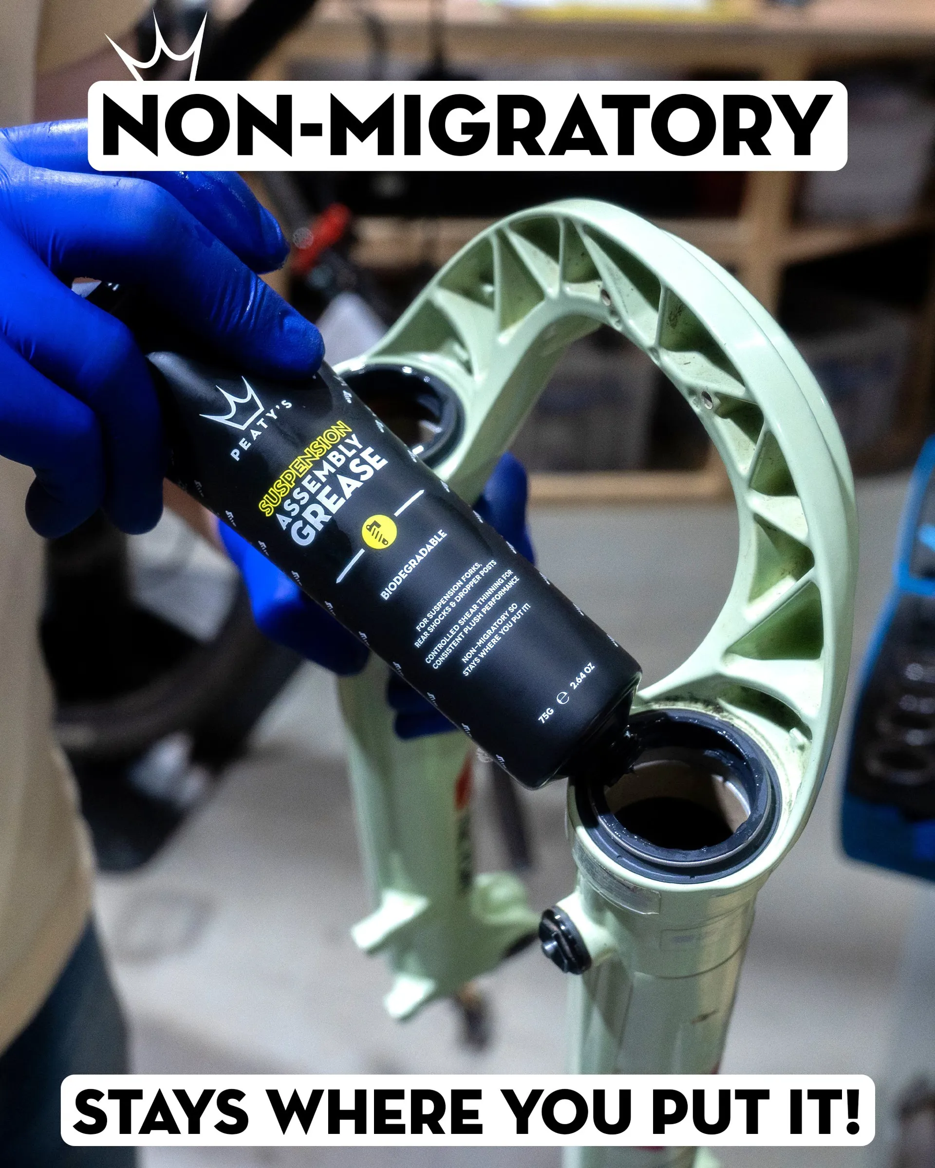 Peatys grease has been designed to have a controlled level of shear thinning which means your suspension will feel consistently plush throughout your ride or race run. This then also makes it non-migratory which means it stays where you put it!