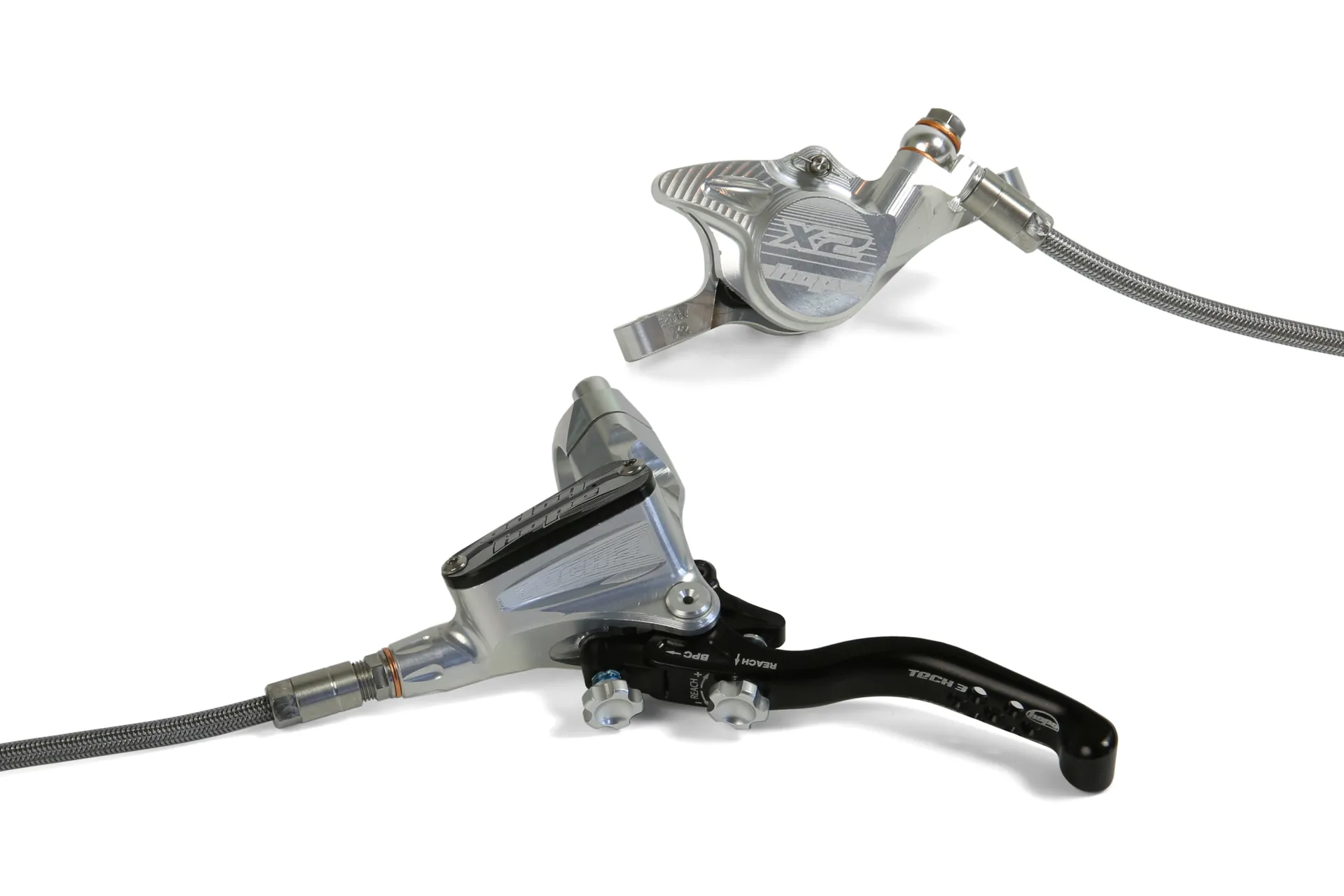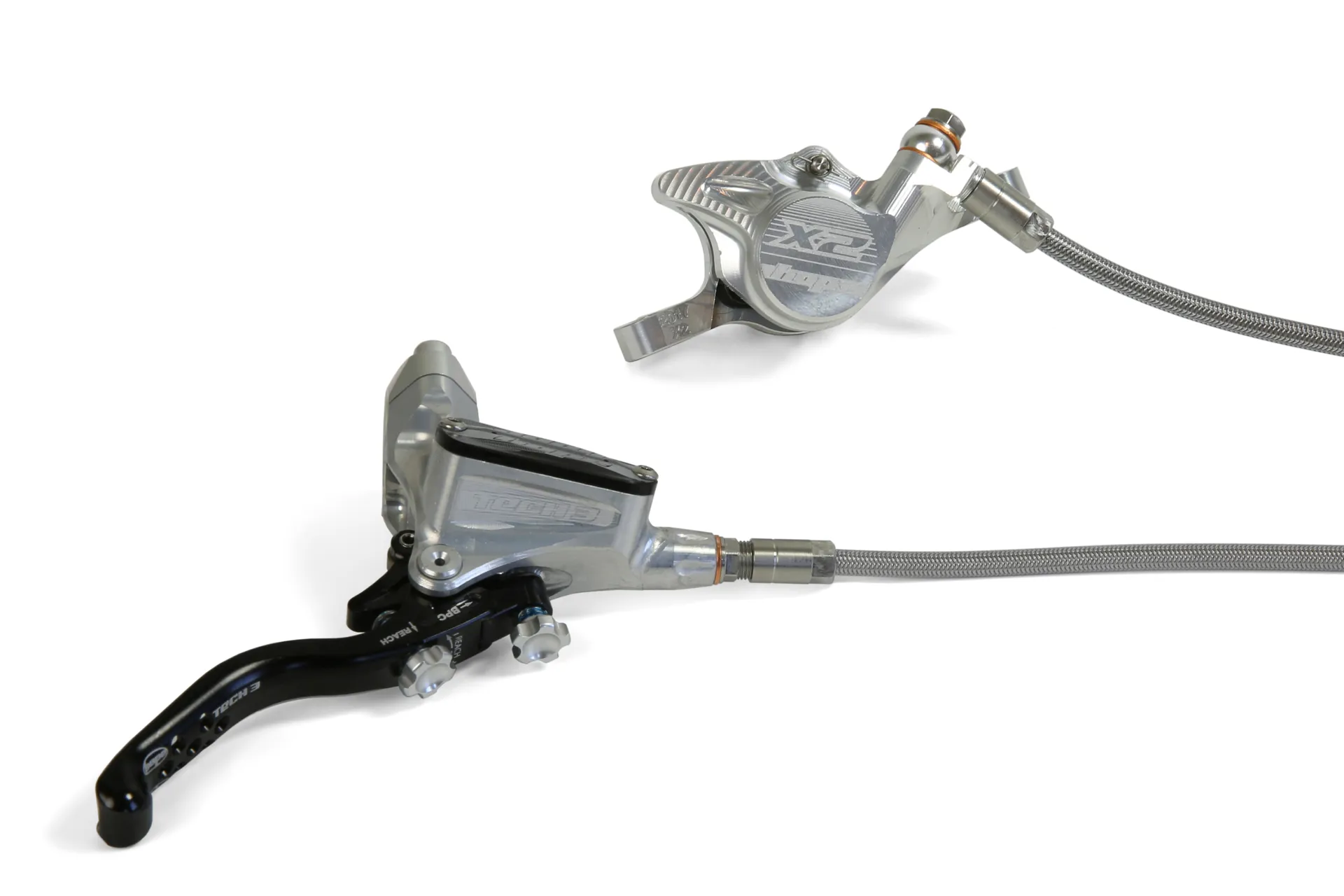The Hope Tech 3 X2 Disc Brake Braided see the Tech 3 Lever and the X2 caliper compine to bring you the benchmark XC brake. The Tech 3 X2 brake takes the performance of the award winning Mini and sheds a few more precision grams without compromising on power and modulation