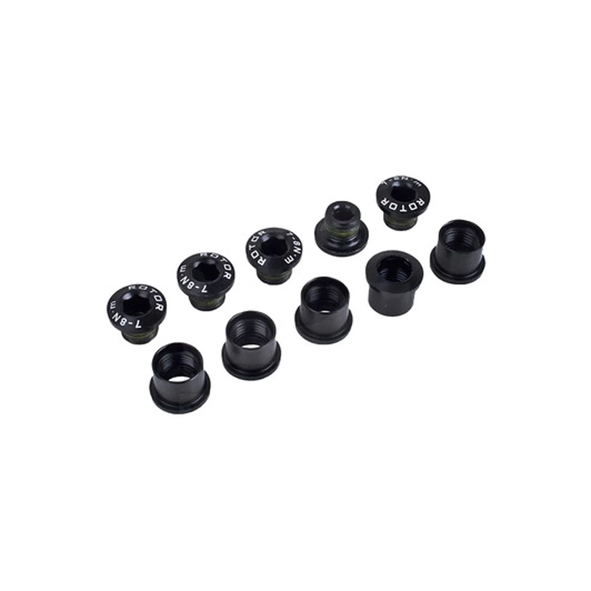 The Rotor Road Bolt Set (5 Bolts and 5 Nuts) allows riders to connect five-arm rotor cranks to rotor chainrings and Q-rings. The five M8 bolts and five M8 nuts have a super-strong 7075 T6 aluminium construction that maintains your crankset's stiffness and longevity. Black Anodized Finish.