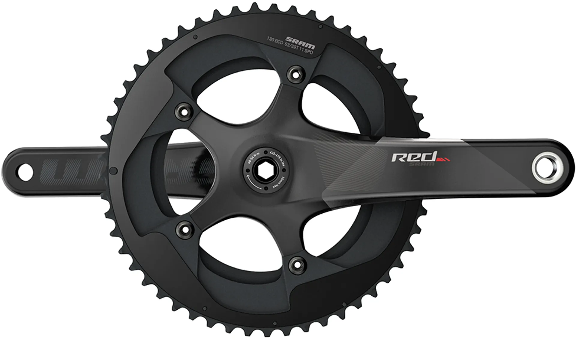 The  Sram Red eTap 172.5mm Chainset is now available with refreshed graphics to complement our new SRAM Red eTap componentry. The SRAM Red crankset features a completely hollow construction all the way to the spider. Its hidden bolt pattern makes better use of carbon fiber to further improve stiffness and shed weight. As always, for seamless, flawless performance and Yaw™ compatibility, pair this crank with X-GlideR™ chainrings.