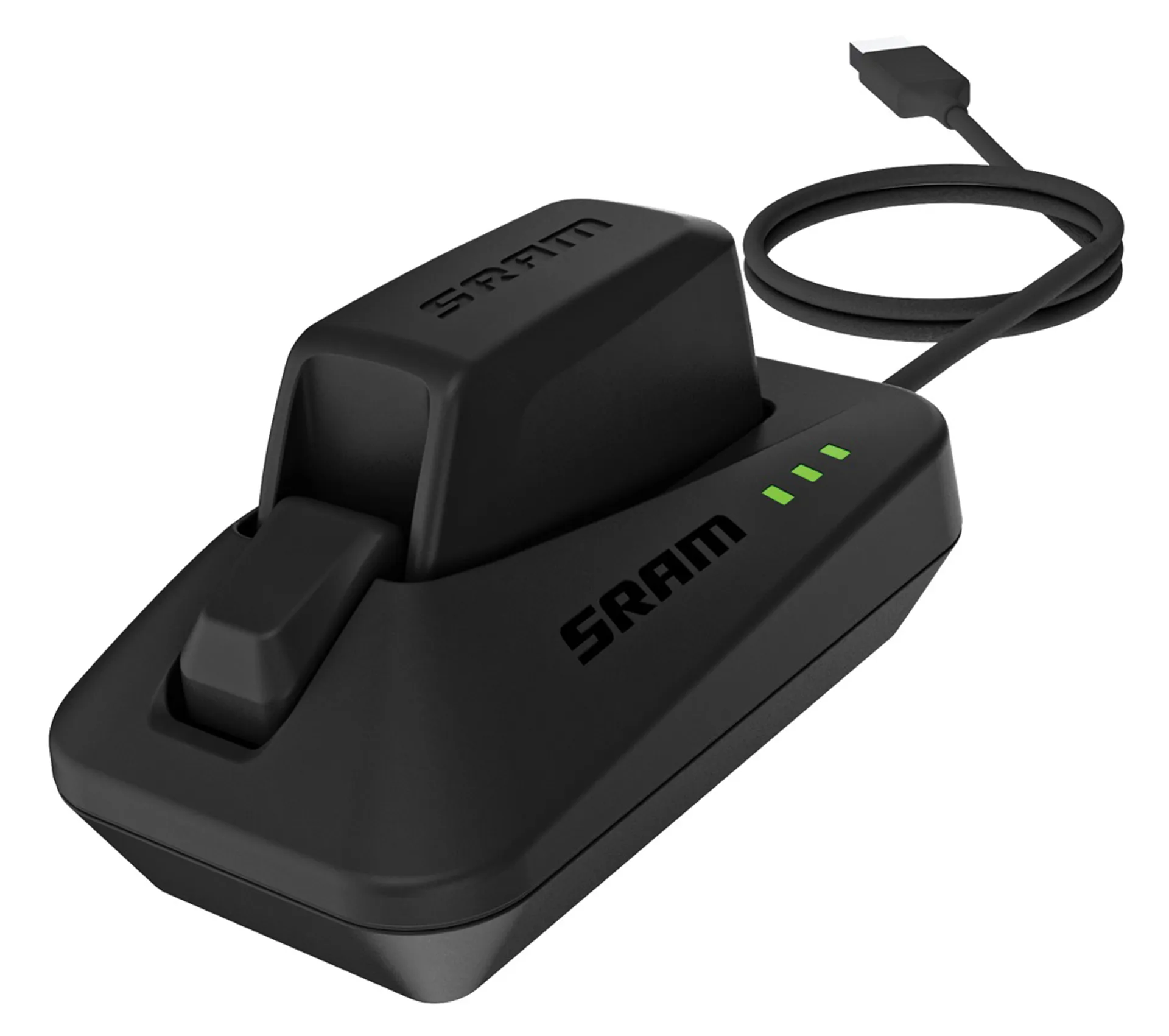The SRAM eTAP Battery Charger and Cord makes charging your eTap battery simple. eTap batteries are literally a snap to remove and charge. Just flip the tool-free battery latch up and slide the battery up and out of the derailleur. Then snap the battery into the USB powered charger and connect the charger to any USB power source or A/C USB adaptor.