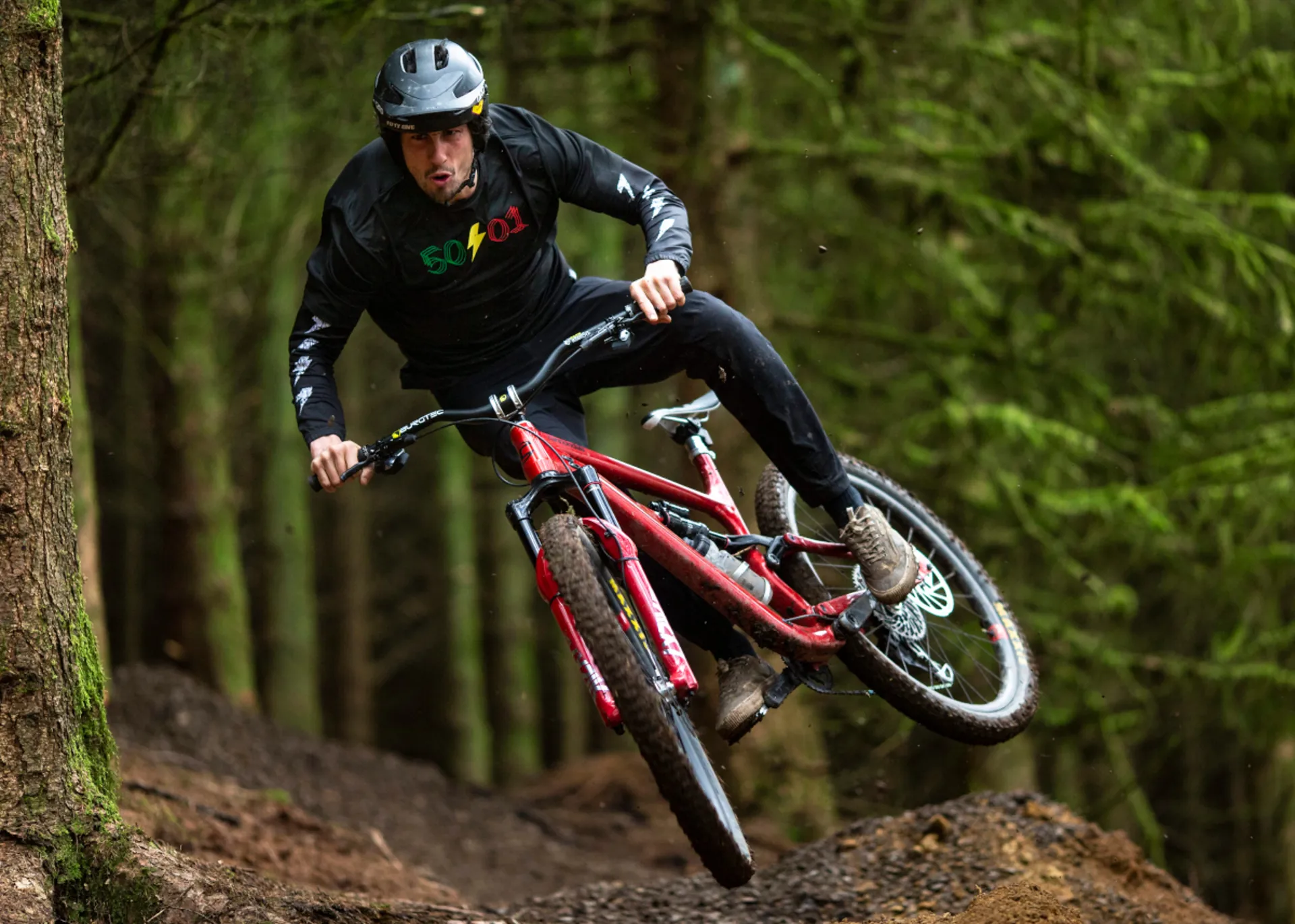 Josh quickly adapted to the 38s but still felt he was running a lot of stack on his bigger travel bikes. So with more frequency, he was popping into Burgtec HQ asking if they had any of the 50mm rise bars left.
