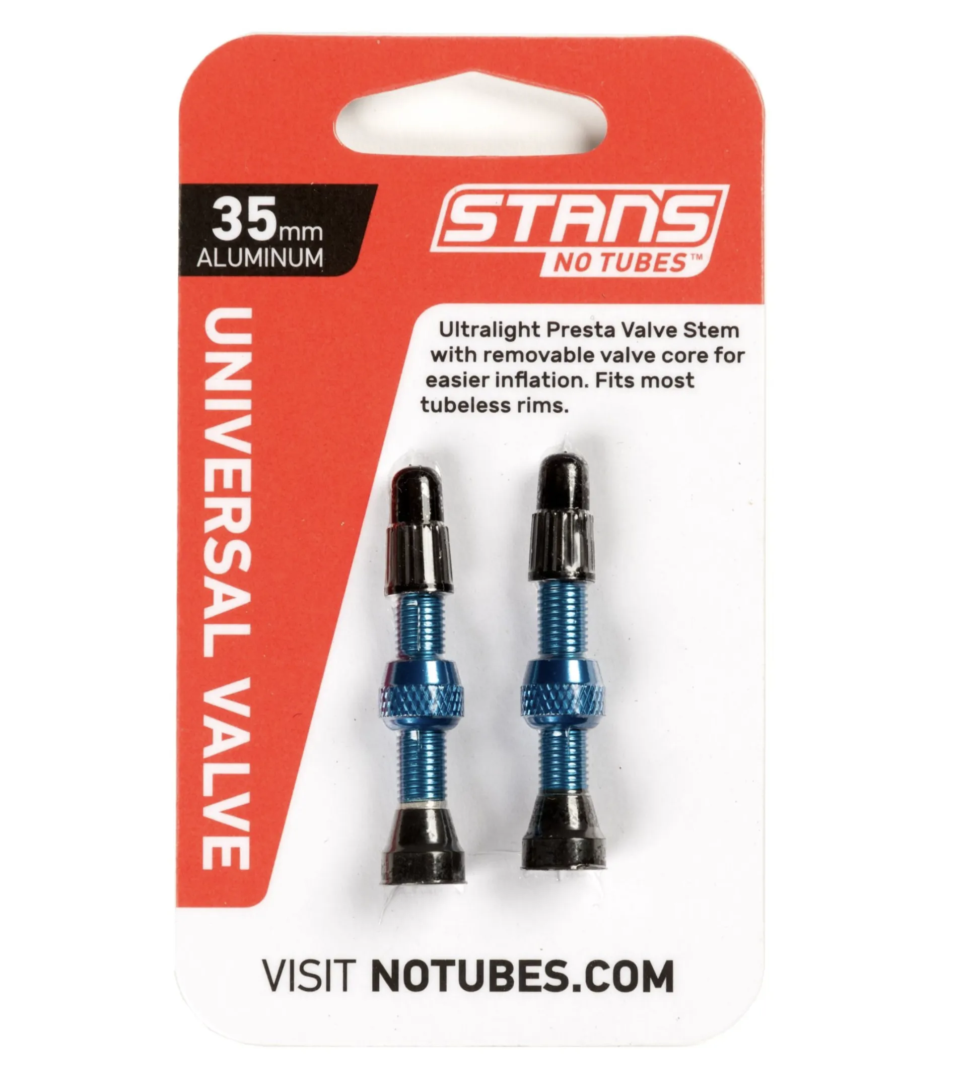 Stan's lightweight aluminum valve stems are half the weight of their standard brass valves, weighing in at only 8g, 9g or 10g per valve respectively for the 35mm, 44mm and 55mm models.