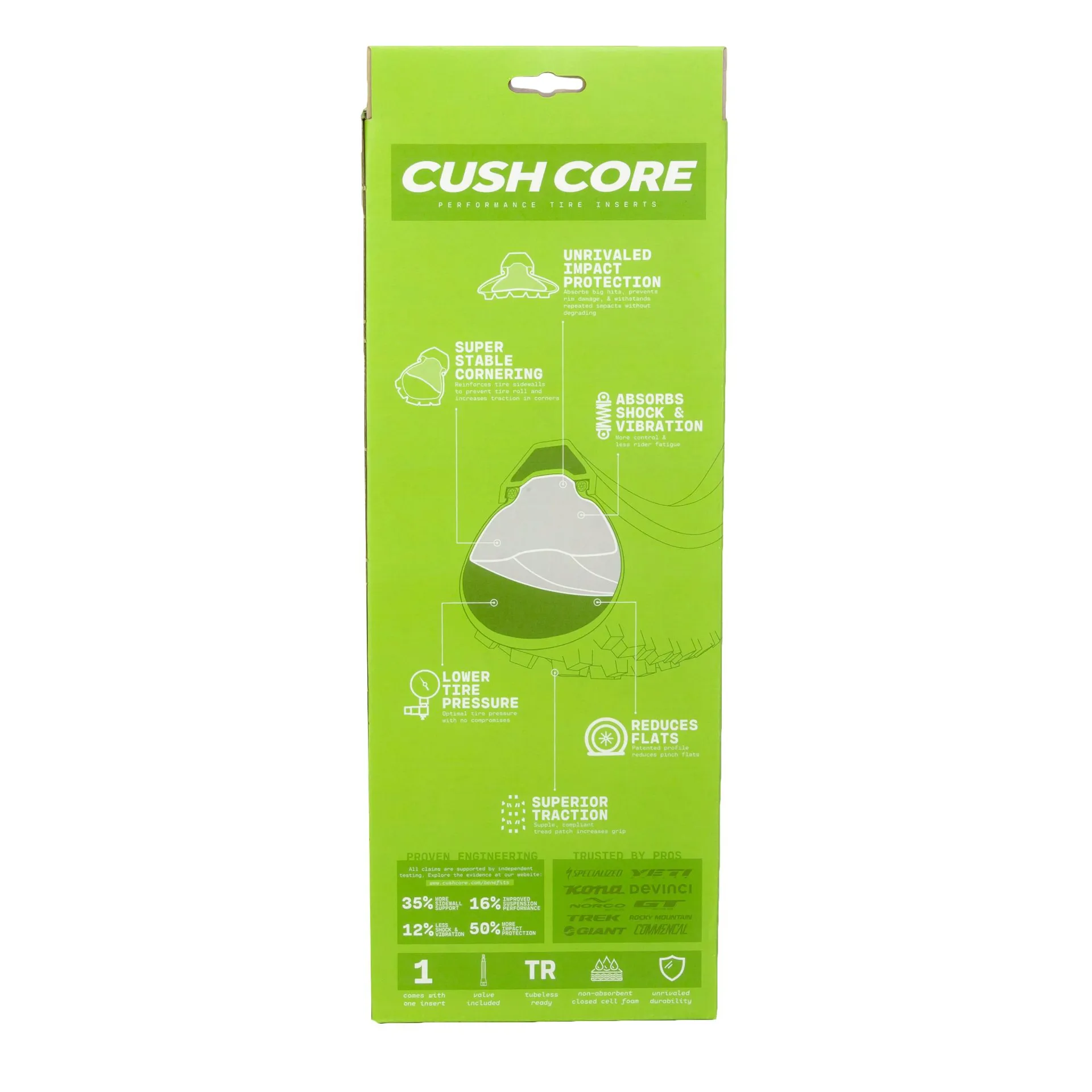 • Includes - Single - (1) CushCore tyre insert, (1) 44mm CushCore green Presta air valve and (2) rim stickers.