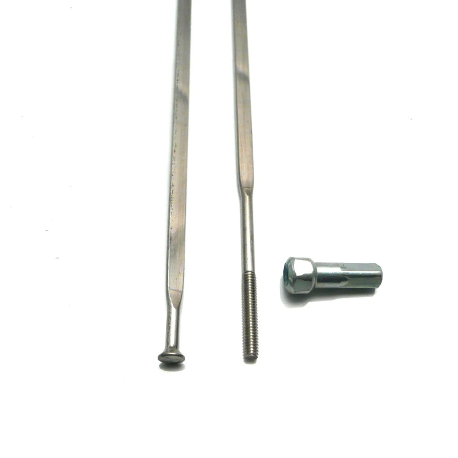 Silver stainless steel flat bladed straight pull spoke for this 700c wheelset.