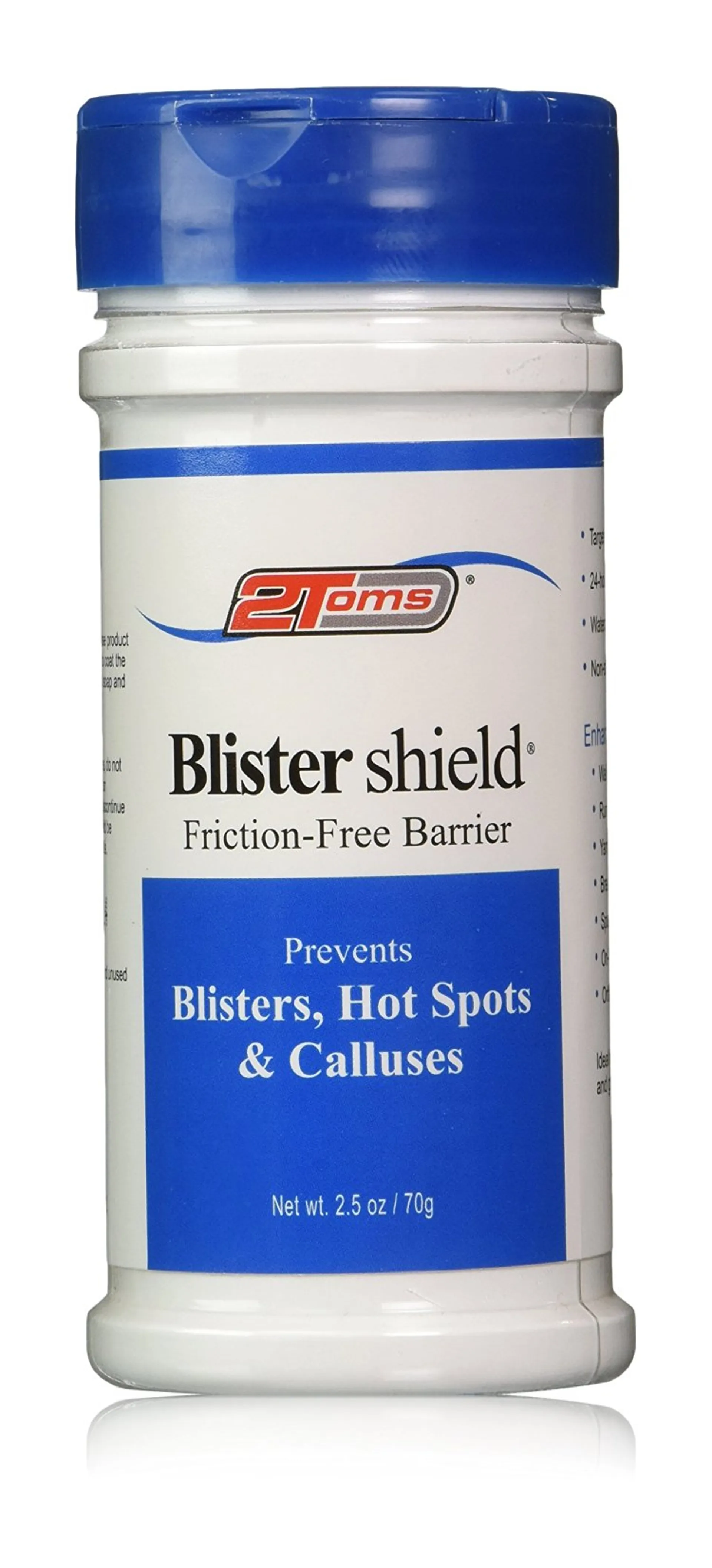 The 2Toms BlisterShield Protective Foot Powder creates an almost frictionless surface on the foot, reducing heat build-up and blisters.  When applied, this powder keeps skin dry and blister-free for lengthy periods