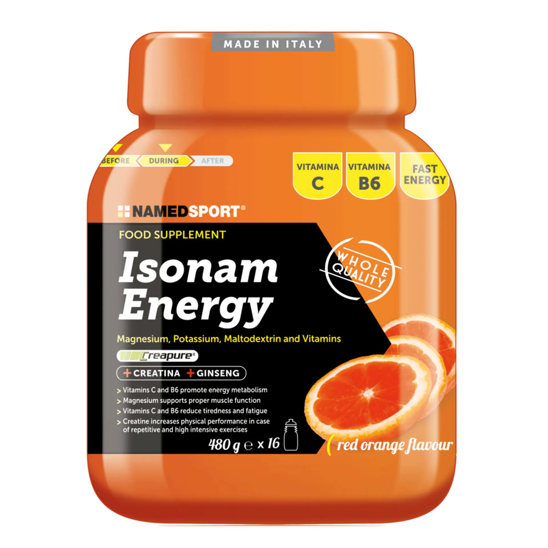 This supplement in powder form, is designed for the preparation of an isotonic drink (314.24 mosm / l). Isonam features magnesium and potassium which helps muscle functionality. Magnesium also contributes to normal electrolyte balance and together with vitamin c contributes to the reduction of tiredness and fatigue. The added ginseng has a tonic effect and is recommended for physical and mental fatigue. The 3g of creatine improves physical performance during repetitive, high intensive and short exercises. The beneficial effect is obtained with a 3g creatine daily intake.