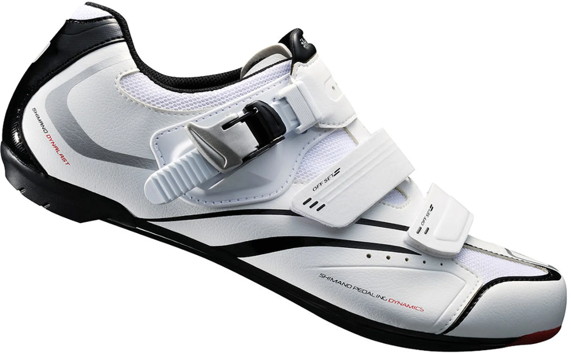 Kicking the shoe off is a low profile, light weight glass fibre reinforced-polyamide sole which is stiff to give better pedalling transfer and therefore more effective strokes of the pedal for better performance and is combined with Shimano Dynalast technology sole for long lasting stiff durability. Next in line on the road shoe is the supple stretch resistant synthetic leather upper with open mesh, not only does this provide comfort but it also offers fantastic breathability.